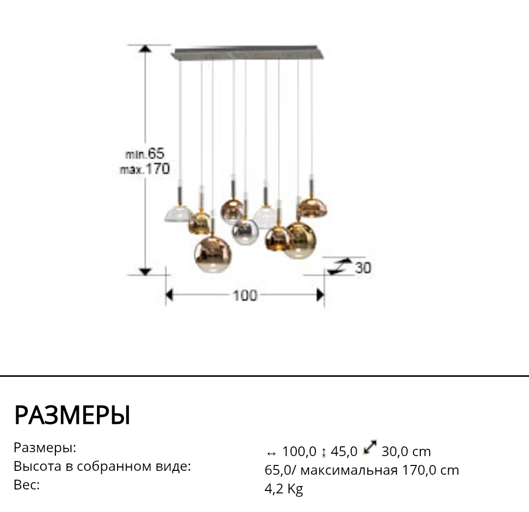 Люстра из коллекции Charlize артикул 312356 с 9 оригинальными разноцветными подвесами разной формы. Основание изготовлено из шлифованного алюминия темно-серого оттенка. Абажуры из прозрачного стекла и с зеркальным электролитическим покрытием медного, золотистого, серебряного оттенков. Светодиодная подсветка с опаловым акриловым рассеивателем в каждом плафоне. Возможна регулировка яркости. TRIAC драйвер и комплект для регулировки яркости. Цветовая температура: 3000 K. Световой поток: 1980 Lm. Mаксимальная мощность: 79 W. Средний срок службы рассчитан на 50 000 часов.