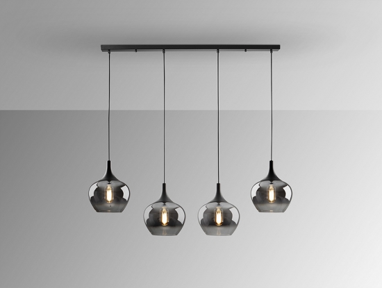 Подвесной светильник Opaz арт. 614245 с четырьмя большими каплевидными плафонами из зеркально- дымчатого стекла. Потолочное основание- прямоугольная планка с отделкой матового черного цвета. Высоту подвешивания каждого подвеса диаметром 19 см можно по желанию регулировать. Лампочки: 4 шт E27 LED max 20W.
