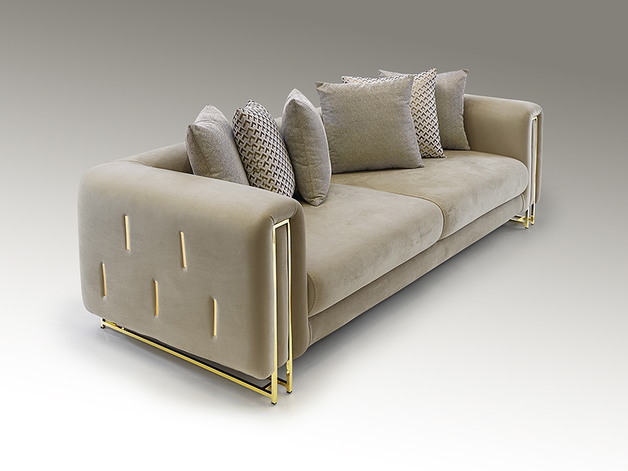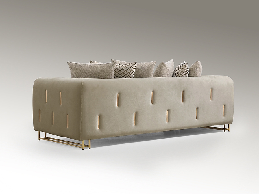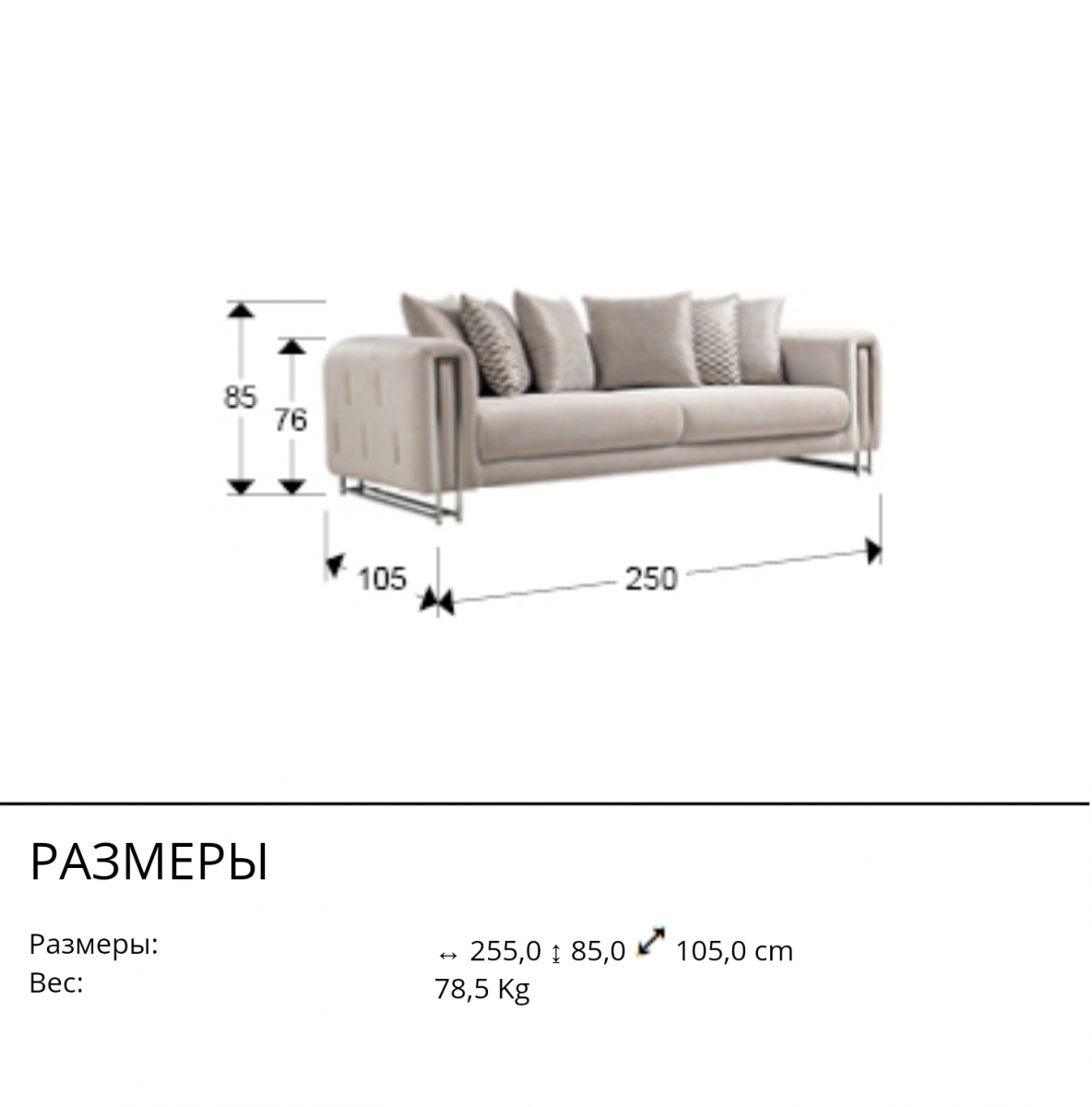 Широкий бежевый трехместный прямоугольный диван из коллекции Viena с декоративными квадратными подушками на спинке. Сочетание бархата и металла. Отличие модели: плавные скругленные линии подлокотников в сочетании с тонким оригинальным стальным каркасом и декоративными вертикальными вставками на внешней стороне спинки. Вариант, который подойдет и в современный интерьер, и в неоклассику. Все металлические детали золотого цвета. Общая ширина дивана 250 см. Высота спинки без учета декоративных подушек 33 см. Обивка из ткани 100% ПЭ плотностью 320 г/м2. Каркас изготовлен из бука, наполнение из ППУ 36 кг/м3 и холофайбера.