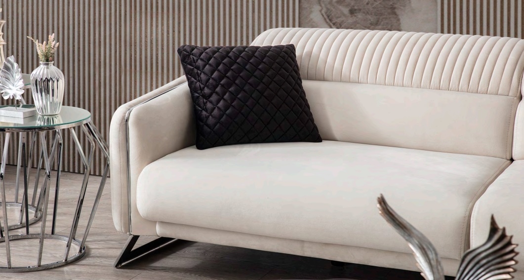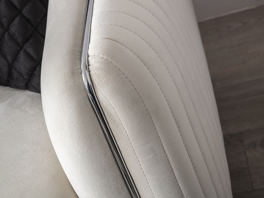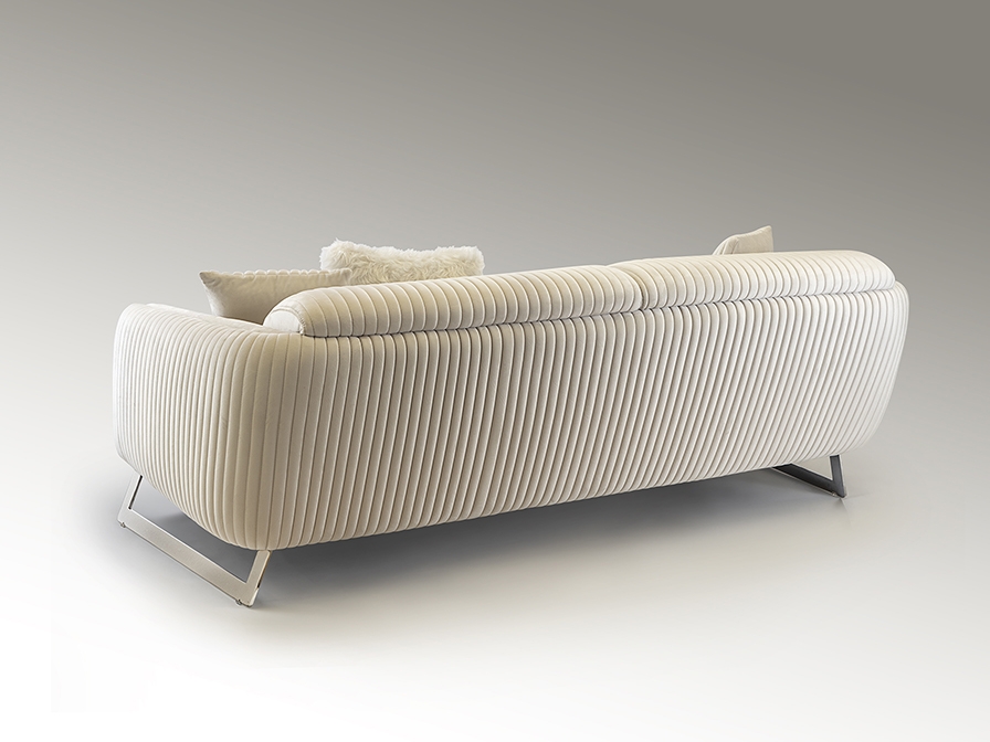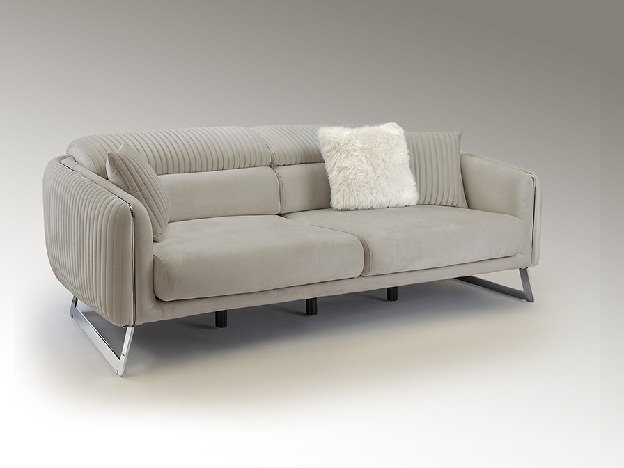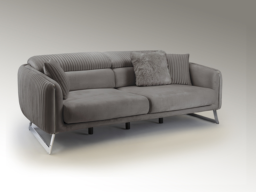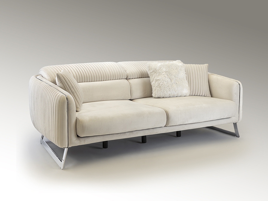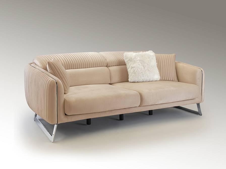 Трехместный диван из изысканной бархатной коллекции Milan с двумя большими подушками на сиденье и вертикальной декоративной отстрочкой на спинке и внешней стороне подлокотников. Стальной футуристичный каркас ножек перекликается с хромированными вставками на подлокотниках. Вариант, который подойдет и в современный интерьер, и в неоклассику. Все металлические детали хромированные. Цвет бархатной обивки дивана возможен на заказ. Контрастные подушки идут в комплекте. Общая ширина дивана 230 см. Высота спинки 39 см. Обивка из ткани 100% ПЭ плотностью 320 г/м2. Дополнительные опорные 3 ножки и каркас изготовлены из бука. Наполнение мягких форм из холлофайбера и ППУ 36 кг/м3.