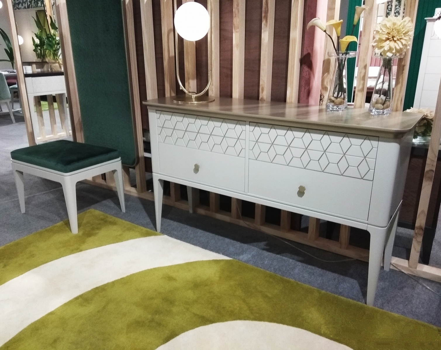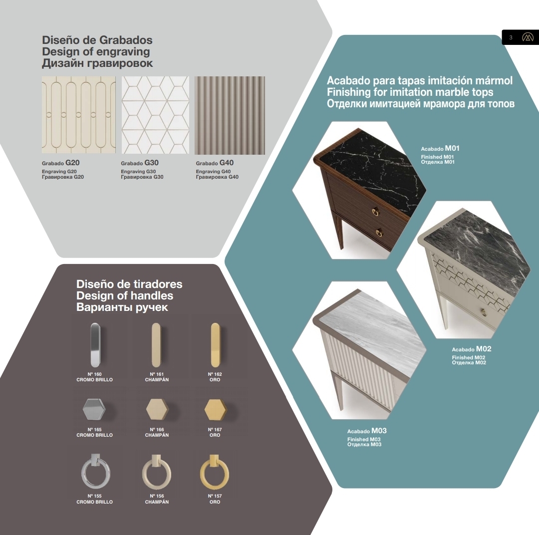 Стильный компактный комод с гравировкой на фасадах двух ящиков в неоклассическом стиле от испанской фабрики из обновленной коллекции Мария, предоставляющей возможность "собрать" собственную мебель под конкретный интерьер: от выбора ручек, цвета, типа столешницы до рисунка гравировки на ящиках. Представленный на фото комод длиной всего 141,6см и замечательно подойдет для небольшой прихожей либо спальни. Для просторных помещений в коллекции есть модели длиной 181,5 см и 201,9см. Столешница и рисунок гравировки сделаны в цвете "шампань", контрастирующим с остальным корпусом. На заказ возможны любые сочетания, а также изготовление полностью в одном цвете с ручками в цвете "хром" либо "золото".