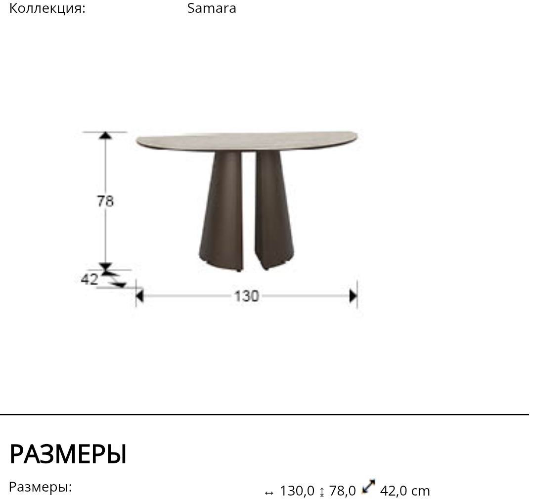 Трендовая полукруглая консоль Samara 498920 с отделкой в теплых тонах от фабрики Schuller. Металлическая опора изготовлена в виде оригинальных двух ножек с оксидно-коричневой отделкой. Столешница 130 см из МДФ с высокопрочной меламиновой поверхностью под травертин и торцами в цвет ножки. Модель универсальная, подходит для стилистически разных интерьеров. Глубина 42 см оптимальна как для прихожей, так и для комнаты.