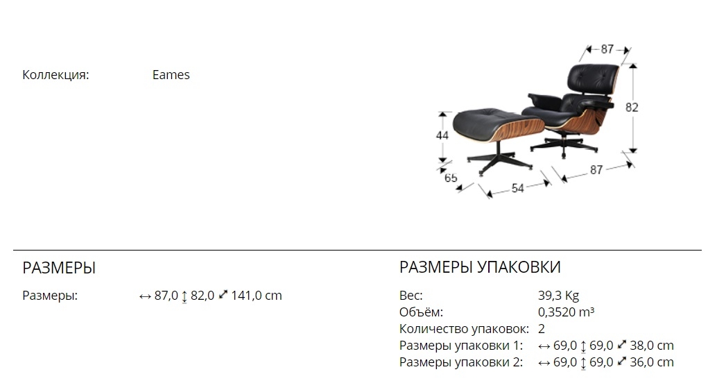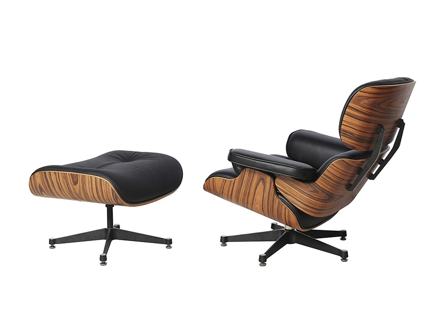 Шезлонг с культовой моделью Eames- это комплект из кресла и подставки для ног. каркас сделан из изогнутой фанерной конструкции, отделанной натуральным палисандром. Сиденье обито черной натуральной кожей. Ножки сделаны из полированного алюминия, окрашенного в черный цвет. Размеры кресла: 87x82x87 см. Подставка для ног: 65x44x54 см