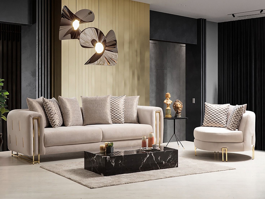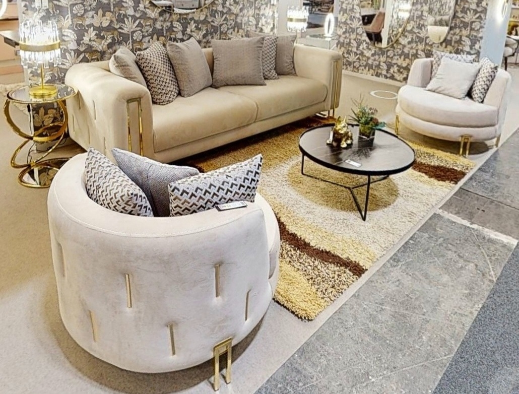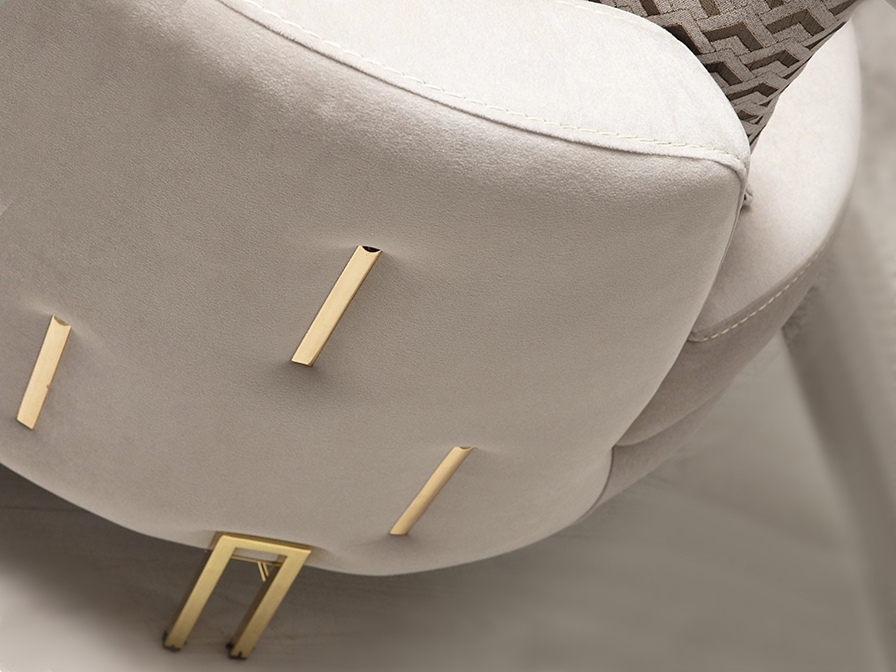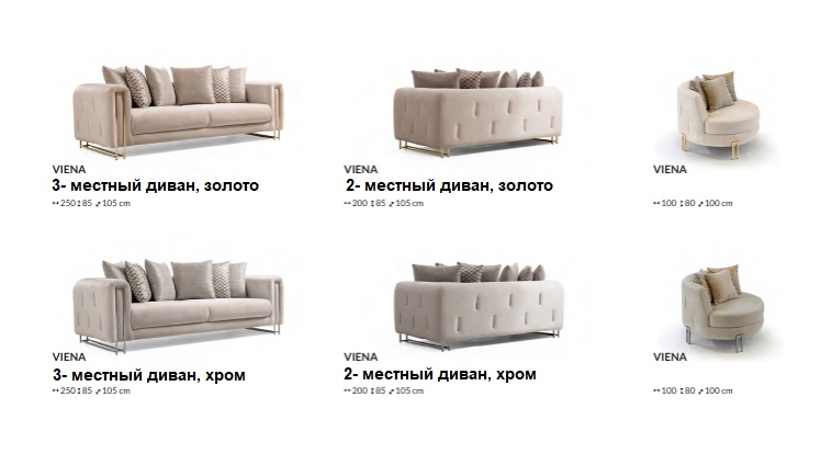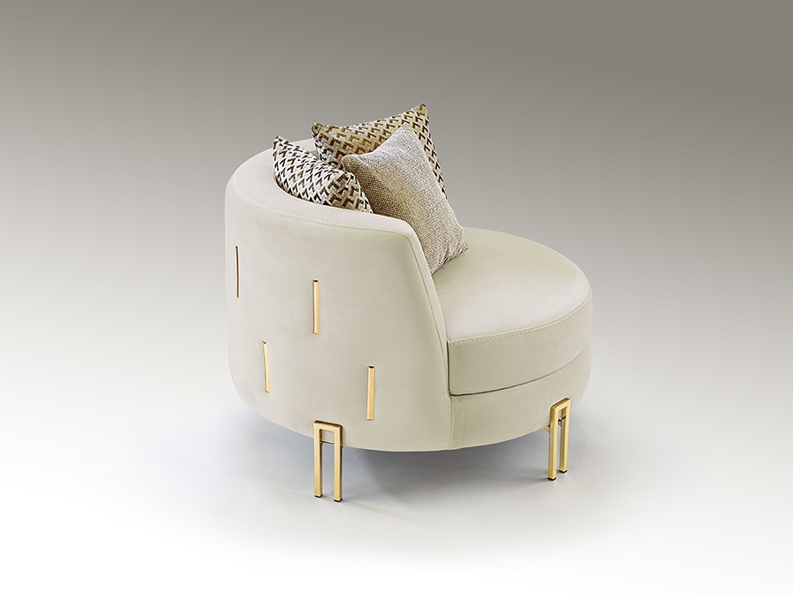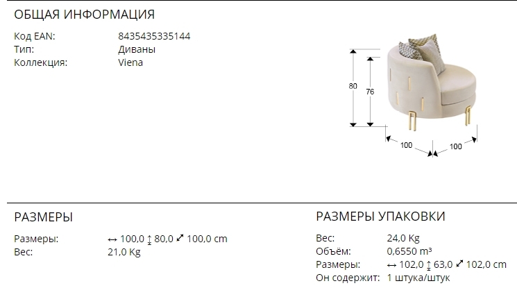 Эффектное и модное кресло Viena, обитое коротковоровым бархатом молочно- белого цвета, с подушками- компаньонами. Модель, которая может стать акцентным и уютным местом в комнате. Диаметр его 100 см. Высота с учетом подушек 80 см. Высота спинки 30 см. Металлические ножки и декоративные верикальные вставки на спинке с глянцевой золотой отделкой. Обивка из ткани 100% ПЭ плотностью 320 г/м2. Каркас кресла изготовлен из бука, внутреннее наполнение из ППУ 36 кг/м3 и холофайбера.