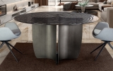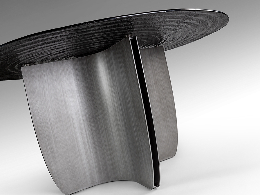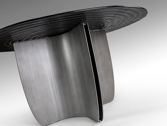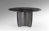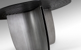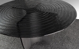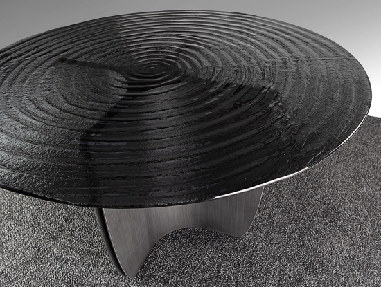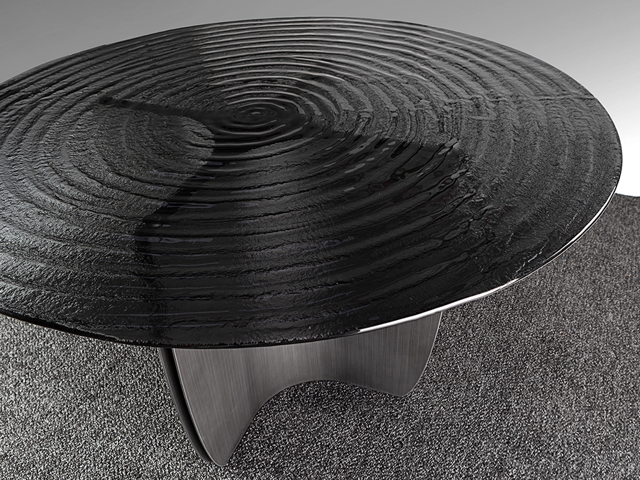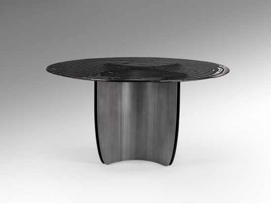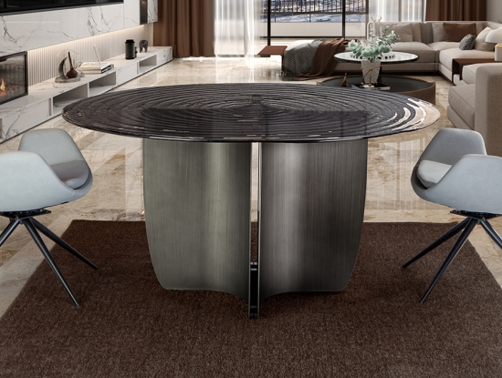 Эффектный круглый обеденный стол Night артикул 503846. Новинка осени 2025 от фабрики Schuller. Стильная ножка- треугольник из металла с патинированным свинцово-серым покрытием и необычная столешница из серого термоформованного стекла с поверхностью в виде концентрических волн. Стол широкий- диаметром 150 см.