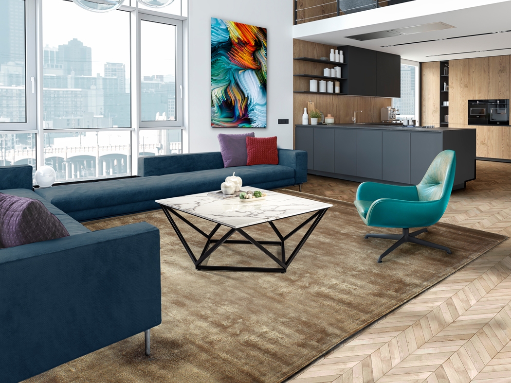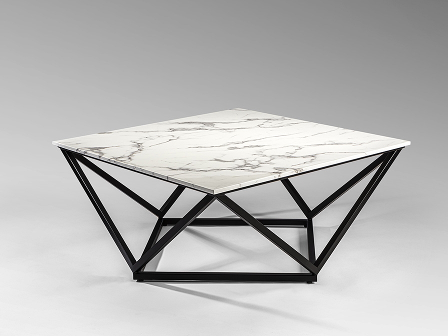 Стильные контрасты: черный матовый металл и белый искусственный мрамор. Новинка осени 2021 года- кофейный столик Luna. Эффектная геометричная ножка добавляет акцента при оформлении интерьера гостиной. Однако, не смотря на большой размер квадратной столешницы 100*100 см, журнальный стол легко смотрится именно благодаря ножке. При оформлении больших пространств квартиры, загородного дома либо общественной зоны можно составить композицию из нескольких столиков. На фото такой пример представлен.
