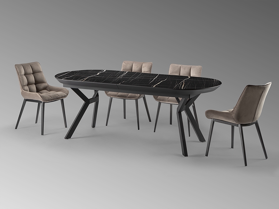 Черный стильный обеденный стол из новой коллекции мебели Antea с фигурными ножками из металла, покрытого матовой краской. Раздвижная столешница включает две вставки по 40 см и сделана из МДФ с износостойким меламиновым покрытием, имитирующей черный глянцевый мрамор с белыми прожилками. В качестве компаньона вокруг стола стоят кресла из коллекции Devany с объёмной обивкой. Купить новую мебель Schuller, не выходя из дома, легко в нашем интернет магазине, сделав заказ удаленно.