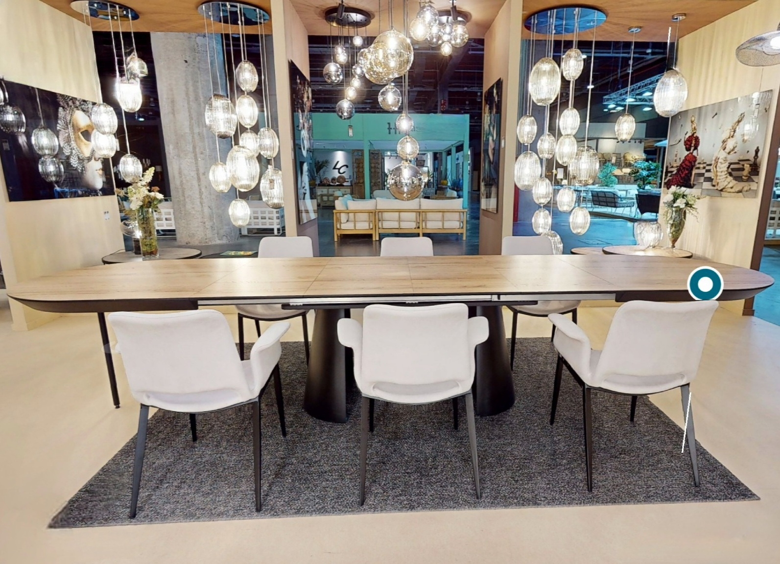 Большой современный обеденный стол из новой коллекции Capri от Schuller с оригинальными стальными радиусными ножками с черным матовым покрытием. Благодаря четырем внутренним вставкам (по 50 см каждая), общая длина овального стола может составить 4 метра. В связи с этим, в комплекте поставляются 2 дополнительные ножки для обеспечения устойчивости столешницы. Она изготовлена из МДФ с меламиновым покрытием высокой стойкости к внешним воздействиям, имитирующим натуральный дуб. Общая ширина стола 103 см. Рисунок на вставках без подбора к основной поверхности.