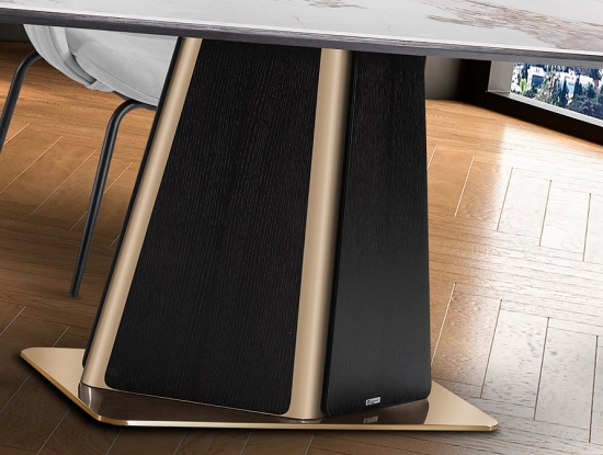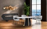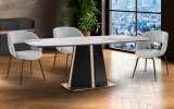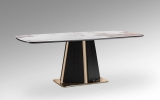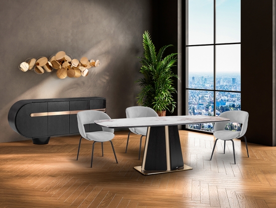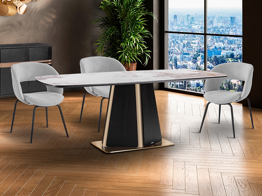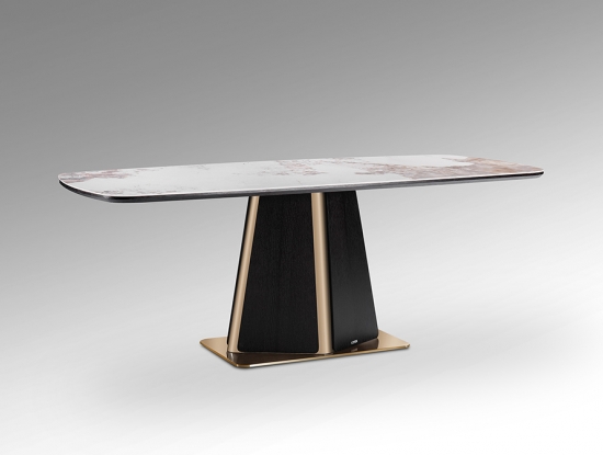 Новинка октября 2025 - эффектный обеденный стол Luca длиной 200 см. Изготовлен из МДФ, шпонированного темным дубом. Стильная ножка из нержавеющей стали притягивает внимание и благодаря форме, и благодаря изысканному блеску покрытия в цвете розового золота. Столешница со скругленныйми краями выполнена из керамики толщиной 5 мм с отделкой под мрамор с прожилками.