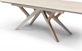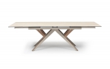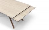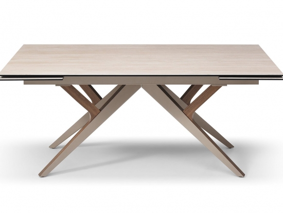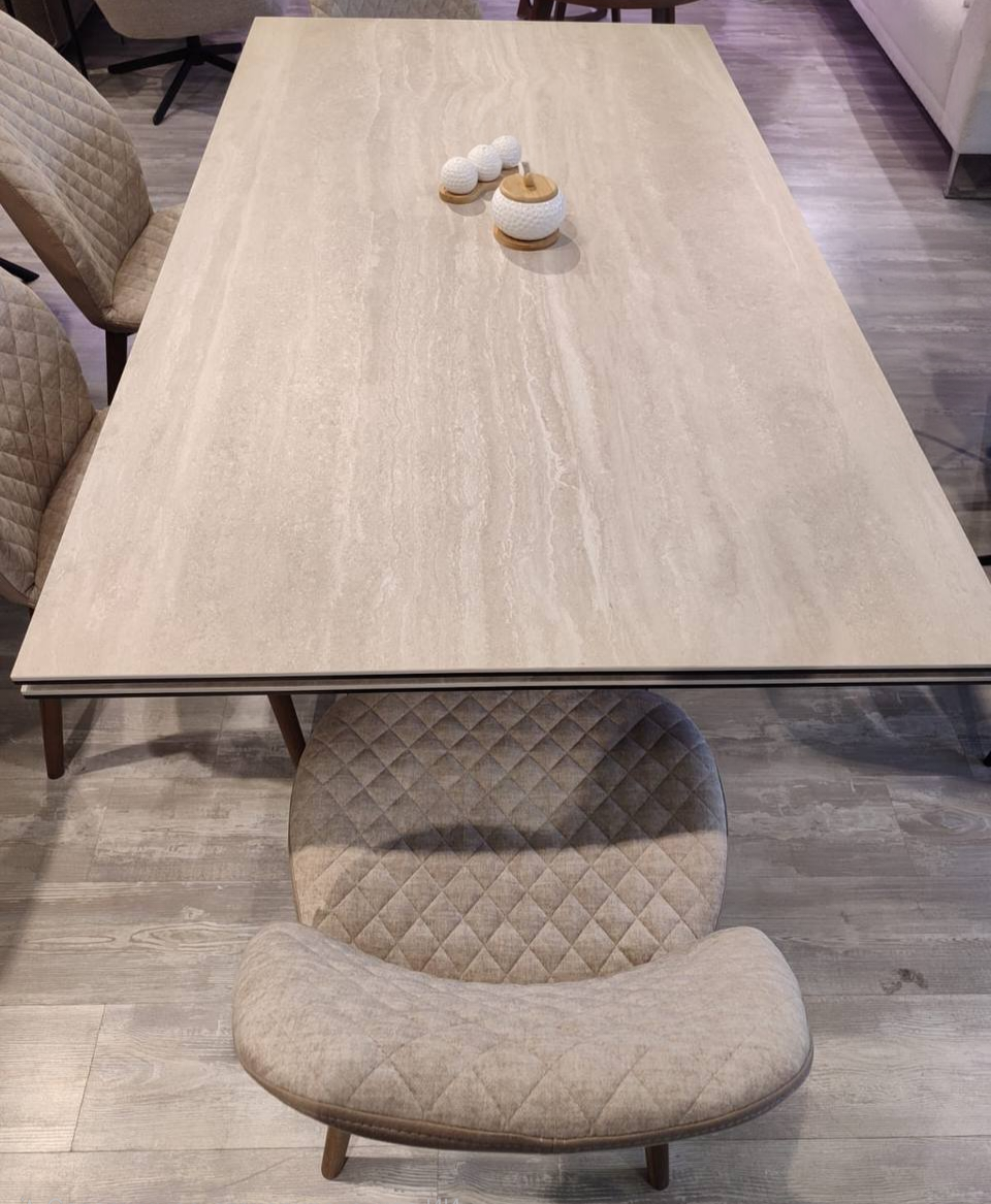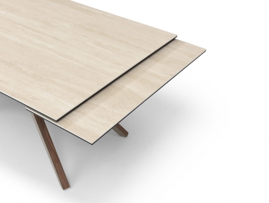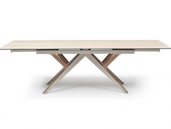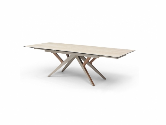 Современный раздвижной стол DT2448 бренда Esf с боковыми вставками по 40 см, увеличивающими общую длину до 260 см. Столешница сделана из керамики толщиной 6 мм в цвете светлого травертина на закаленном стекле. Подстолье с ножками выполнены из металла одного тона и конструктивно дополнены оригинальными вставками из массива дерева и шпона ореха (цвет TAUPE). Сочетание цветов и фактур, приятное для восприятия в интерьере гостиной либо минималистичной кухни.