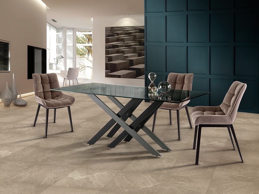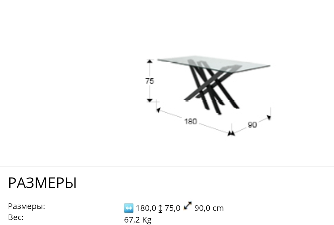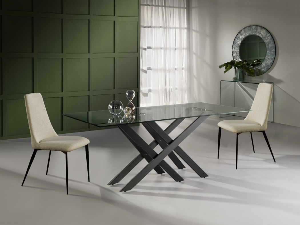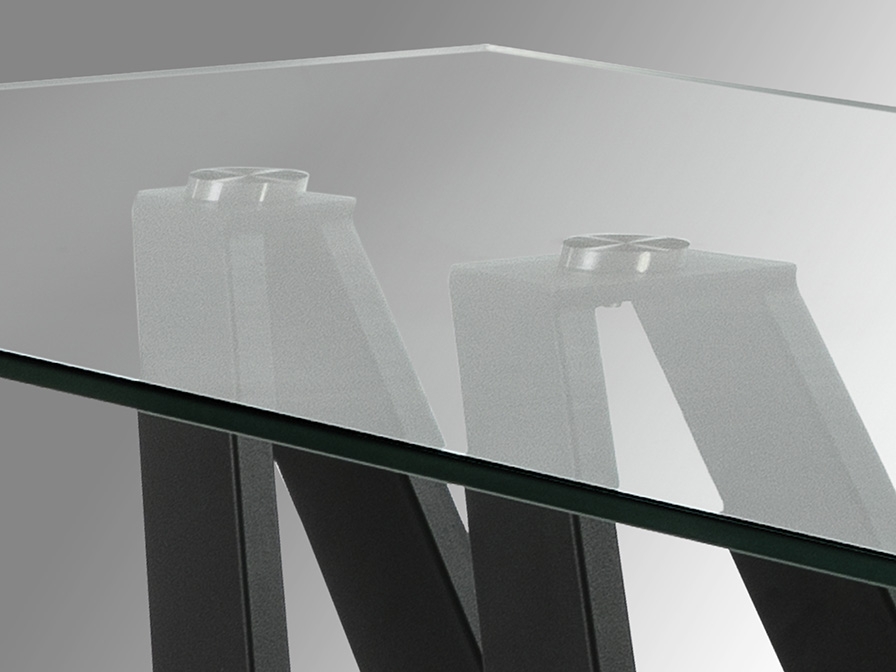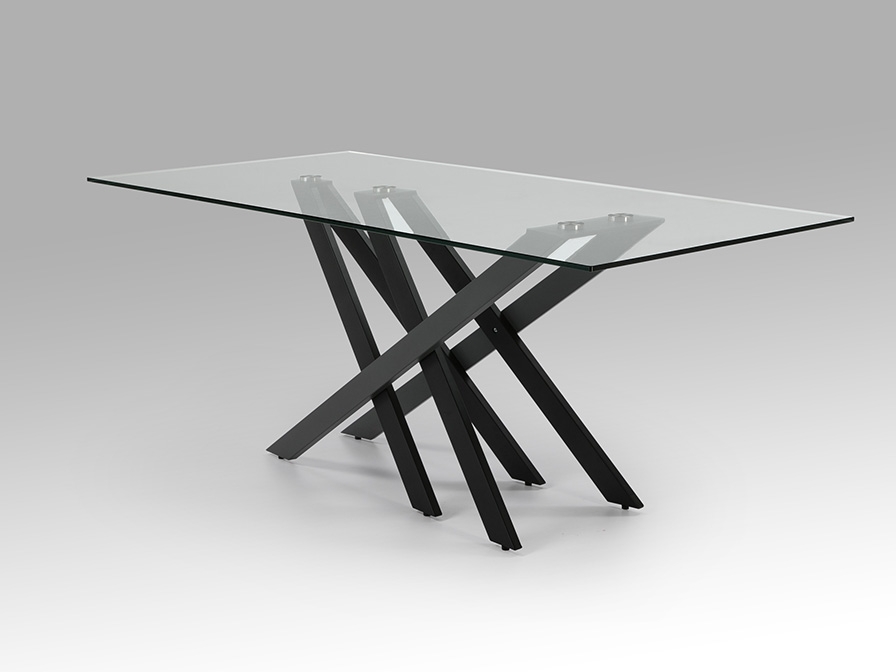 Современный обеденный стол Taima длиной 180 и шириной 90 см с интересной геометрией подстолья, образованного из параллельных и пересекающихся металлических ножек с чёрным матовым и серым покрытием. Прямоугольная столешница сделана из прозрачного закаленного стекла толщиной 12 мм. Простая и в то же время стильная модель.