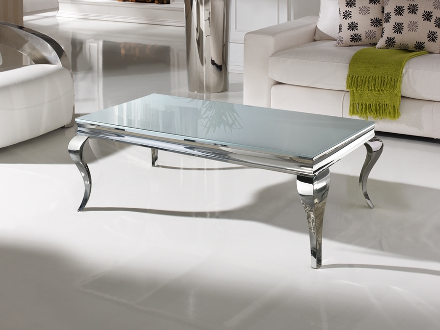 Стол журнальный прямоугольный из нержавеющей стали, столешница размером 130x70x1,2 см из закаленного стекла с полированной кромкой.