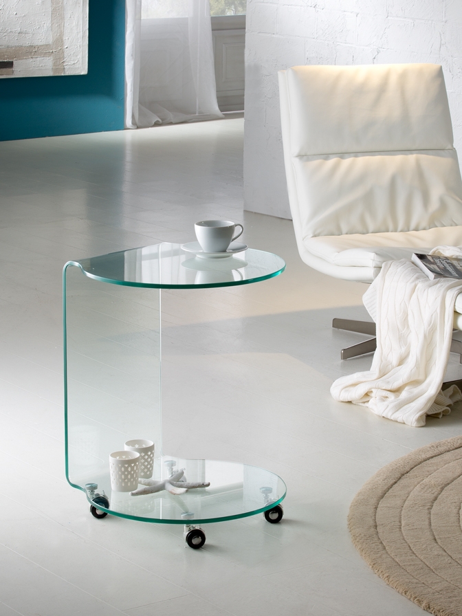 Современный круглый столик- тележка Glass на удобных для перемещения колёсиках сделан из изогнутого прозрачного закаленного стекла толщиной 10 мм. Сохраняет "легкость" пространства, не утяжеляя интерьер. На две полочки диаметром 45 см можно положить планшет, телефон или поставить чашечку ароматного кофе.