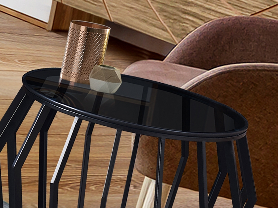 Небольшой придиванный столик из коллекции Ciros диаметром 60 см изготовлен из металла с черной матовой отделкой. Столешница сверху из дымчатого стекла толщиной 8 мм.