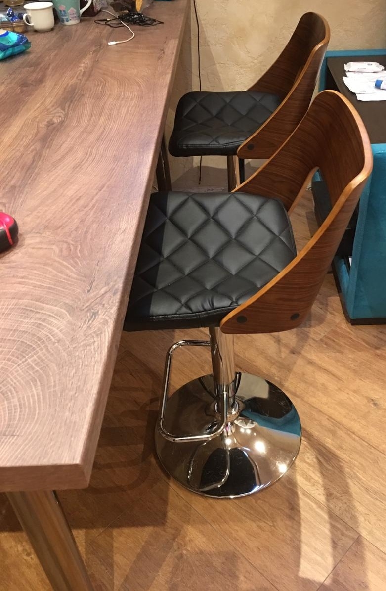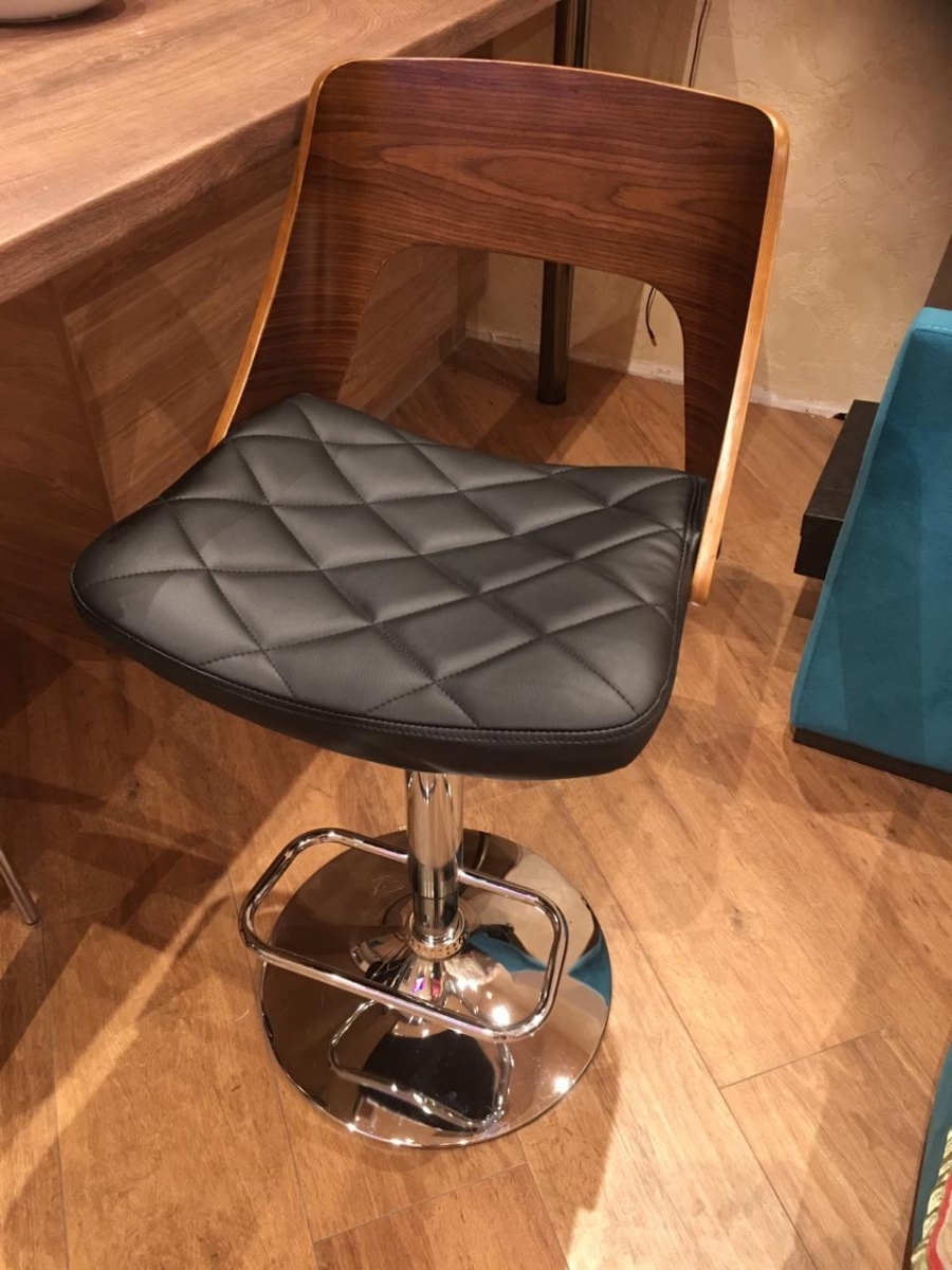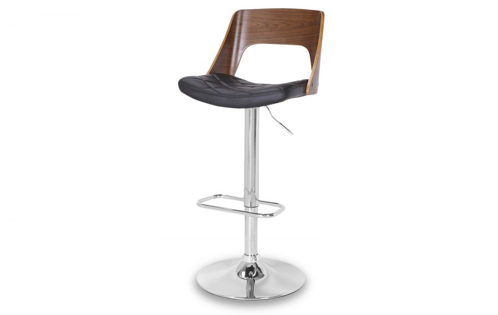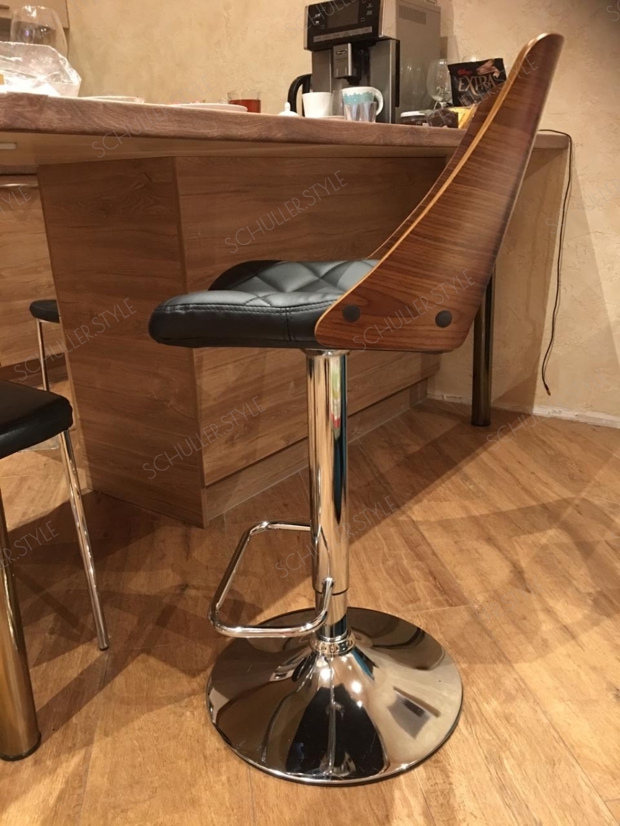 Современный барный стул JY1932 black с жёсткой фигурной спинкой с отделкой шпоном ореха и мягким сидением из приятной на ощупь черной экокожи с декоративной стежкой квадратами. Основание стула и ножка изготовлены из металлокаркаса в цвете "глянцевый хром" с возможностью менять высоту сидения от 61 см до 82см, что очень удобно для комфорта людей разного роста.