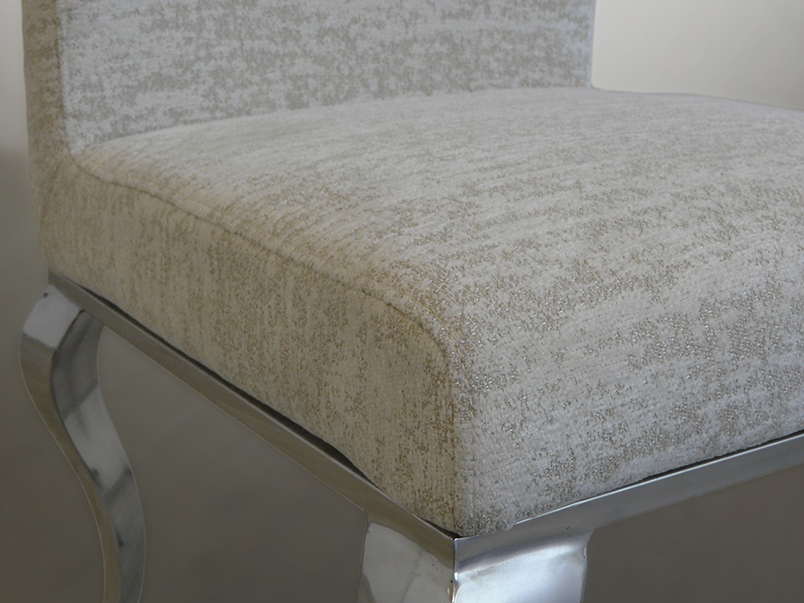 Эффектный стильный стул с ножками из нержавеющей стали из коллекции Barroque фабрики Schuller. Обивка из бархатистой ткани ( шенилл) светло- бежевого цвета. При разном освещении в интерьере (теплый либо холодный свет) приобретает разный оттенок. Стул устойчивый, благодаря весу и форме стальных ножек. Общий вес: 8,6 кг. Состав ткани: ПЭ 31% , хлопок 29%, шелк 22%, шерсть 6%, другие волокна 12%.