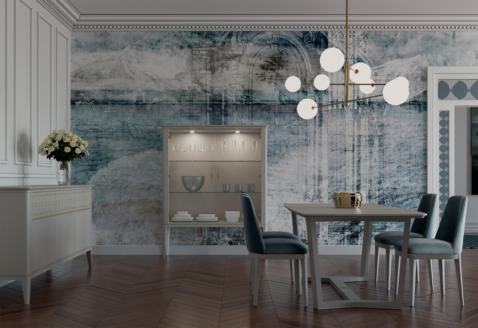 Современная стеклянная витрина из коллекции Мария от испанской фабрики Mugali на высоких ножках в неоклассическом стиле. При желании их можно заменить на низкие, тогда высота витрины будет на 20см ниже- всего 141,7 см. Внутри сделаны три практичные полки из мдф. Две стеклянные дверцы с ручками на выбор. Обеденный стол, стулья и комод, как на фото, можно сделать в одном цвете с корпусной мебелью. Элегантная испанская мебель фабрики Mugali украшает многие интерьеры в Москве, Санкт-Петербурге и Казани.