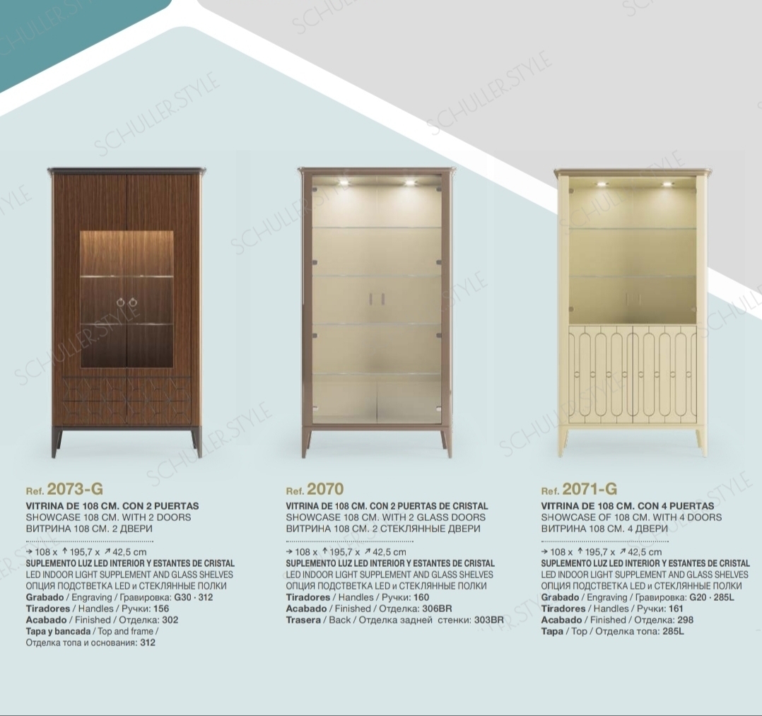 Стильная модель витрины с дверцами двух типов: сверху стеклянные, внизу глухие с декоративной фрезеровкой, которая может быть окрашена в контрастный цвет относительно основного каркаса. Наполнение с глухими дверьми: 1 полка. Наполнение со стеклянными дверьми: 2 полки. По желанию можно сделать led подсветку в верхней части витрины со стеклом. Фабрика Mugali производит коллекцию Maria с учётом пожеланий заказчиков, создав стандартную размерную линейку с возможностью выбора по высоте, ширине и наполнению, поэтому многие дизайнеры выбирают испанскую мебель для оформления современных интерьеров.