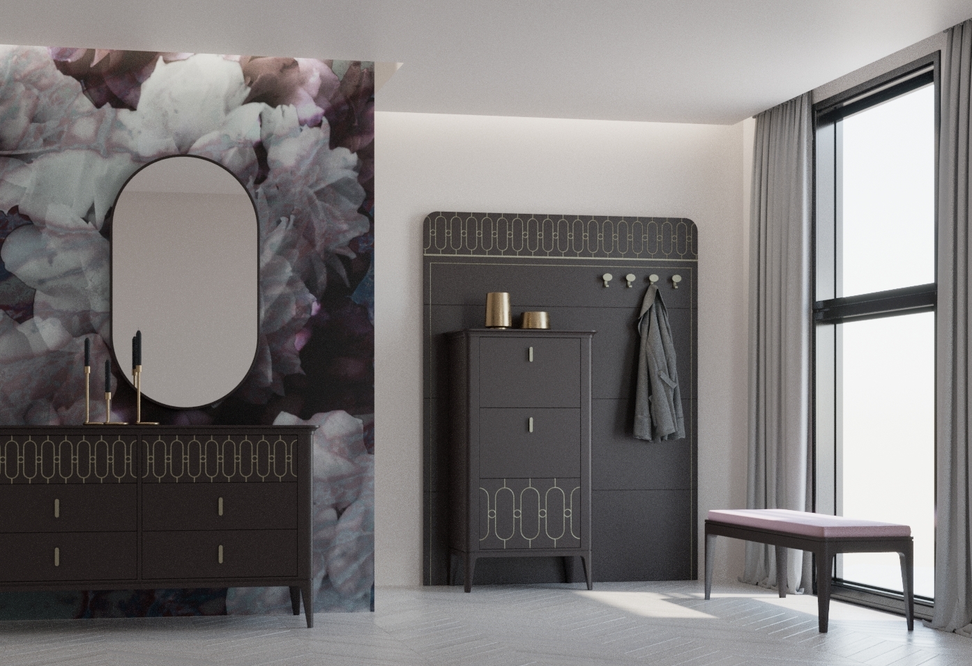 Все предметы испанской мебели на фото, включая зеркало и пуф, из коллекции Maria от фабрики Mugali доступны к заказу. Цвет отделки, вид гравировки на фасадах ящиков на выбор. Низкий комод длиной 160 см.