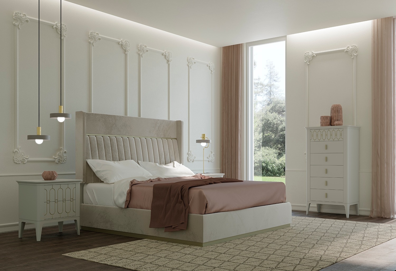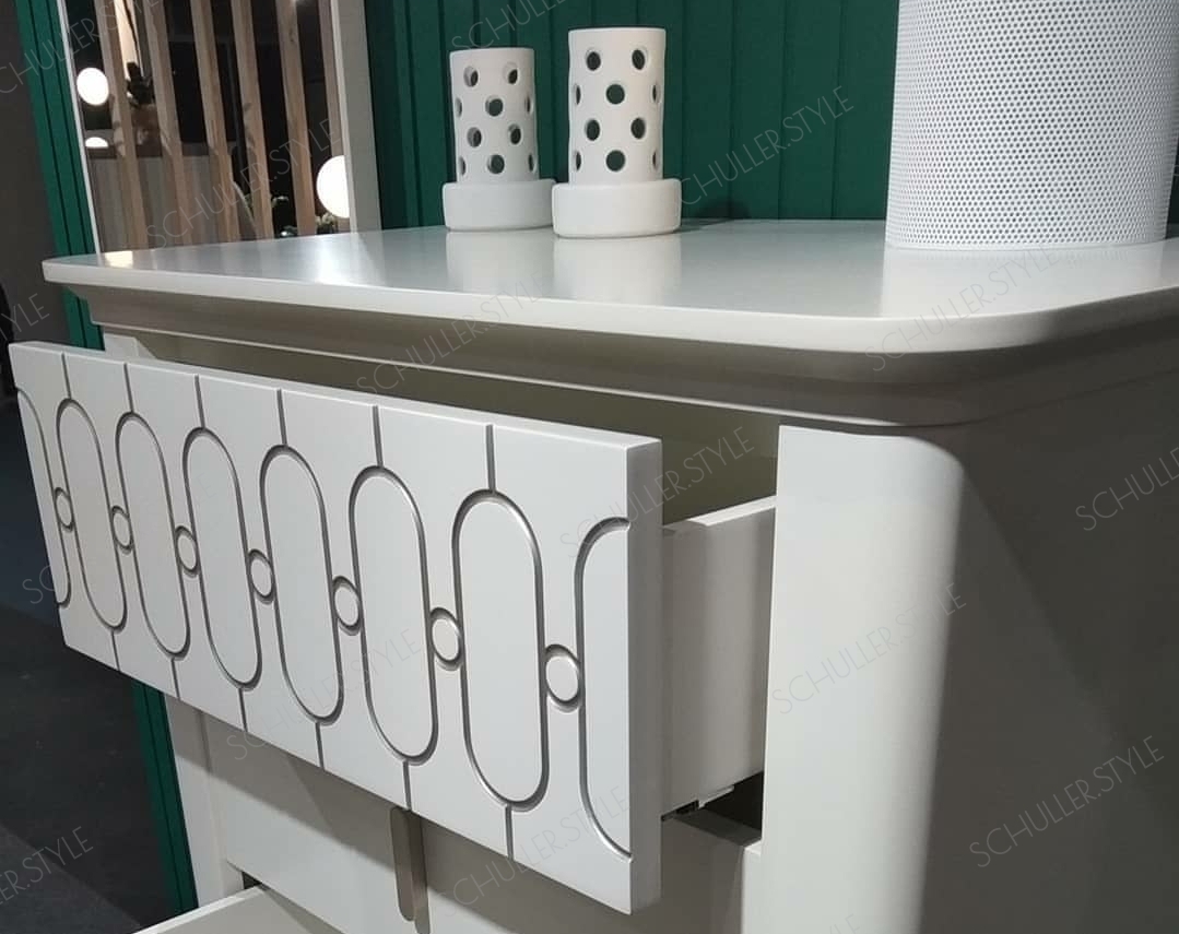 Все предметы испанской мебели на фото, включая кровать и прикроватные тумбочки из коллекции Maria от фабрики Mugali доступны к заказу. Цвет отделки, вид гравировки на фасадах ящиков и обивка изголовья изготавливаются по желанию заказчика, в соответствии с дизайн проектом, создавая тем самым красивый уникальный, индивидуальный интерьер спальни.