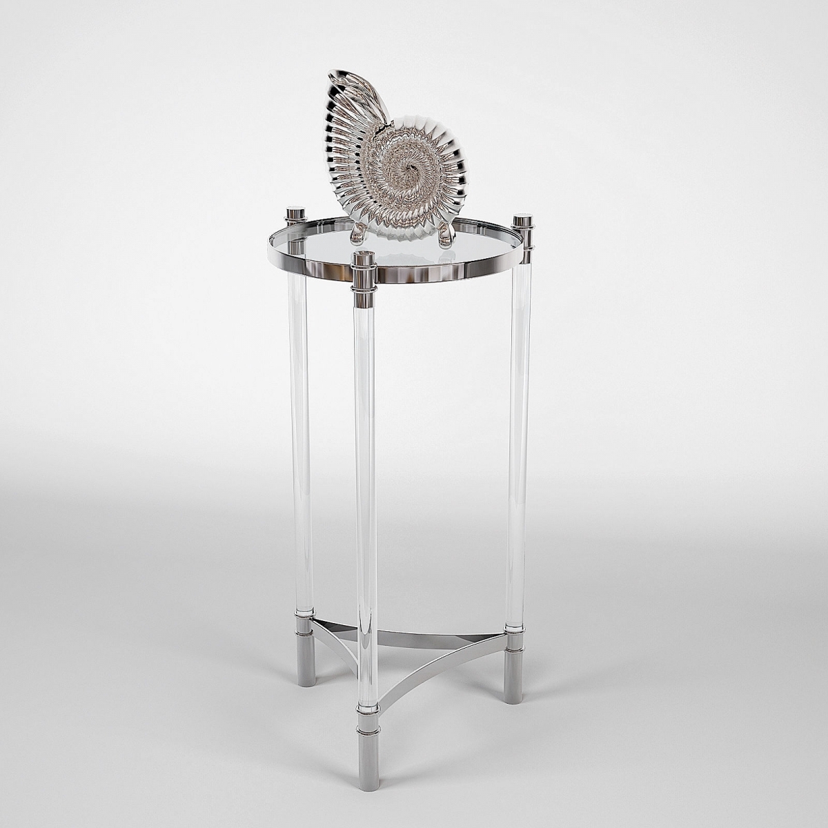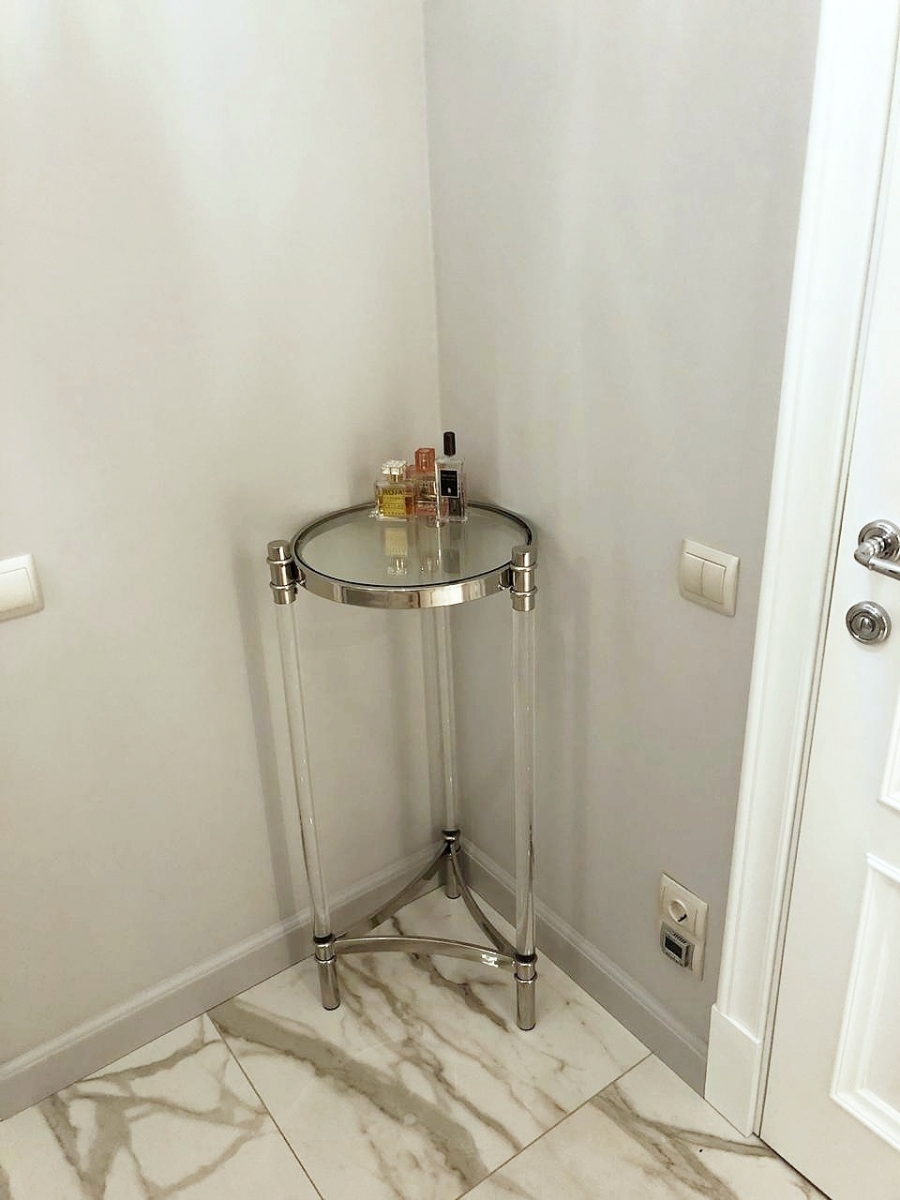Современный высокий столик Trento от популярного голландского бренда Eichholtz .Высота 91 см даёт возможность использовать его, как колонну в прихожей либо гостиной. Прозрачная стеклянная столешница и акриловые прозрачные ножки зрительно не отвлекают внимания, основной акцент сделан на хромированных деталях ножек.