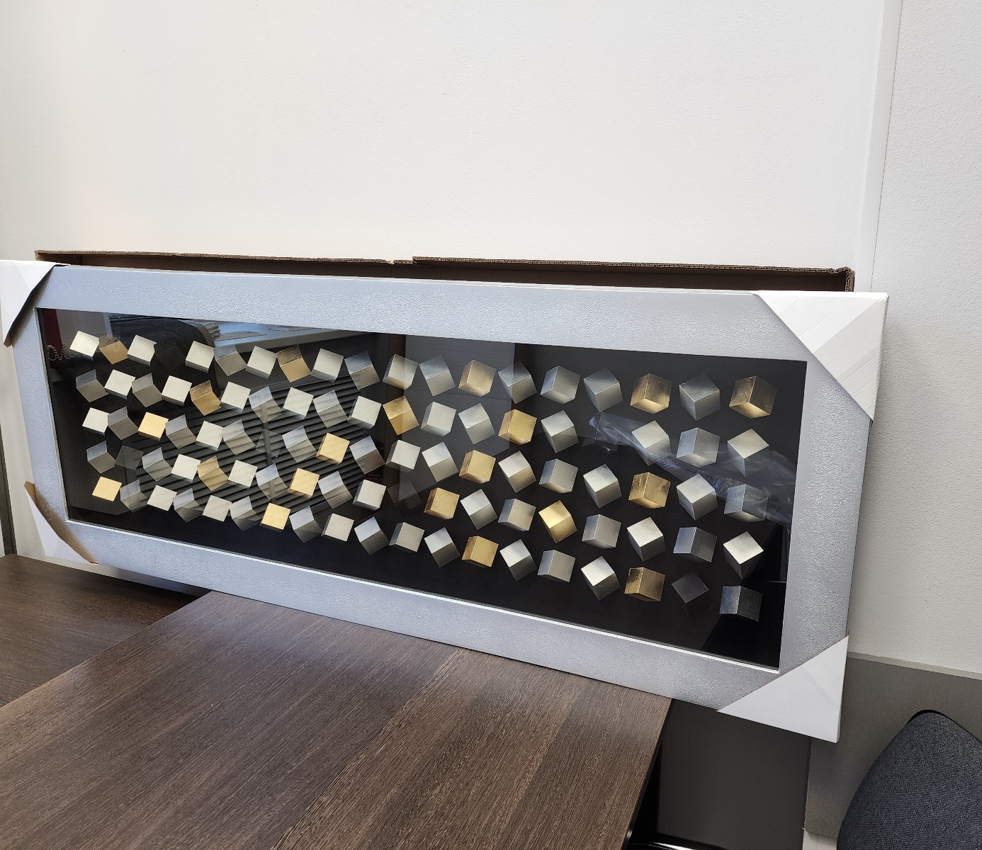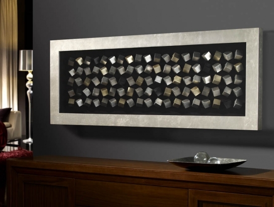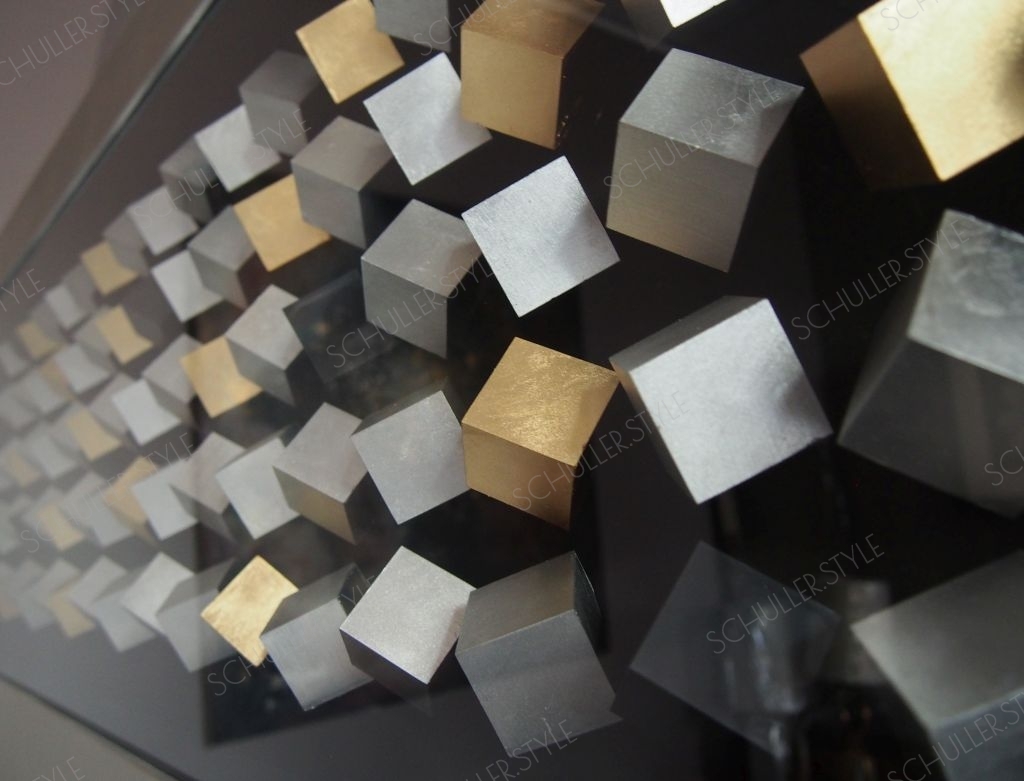 Современный барельеф Cubic c эффектными, объемными кубиками под стеклом в раме серебряного цвета. Стильная, минималистичная композиция на чёрном фоне состоит из комбинации небольших кубов, покрытых сусальным золотом и сусальным серебром с дополнением несколькими черными. Интересное решение при оформлении интерьера современного кабинета либо гостиной. Благодаря цветовой гамме и габаритам настенный декор отлично вписывается в пространство загородного дома либо коттеджа. В разных партиях тон оотделки рамы может отличаться.