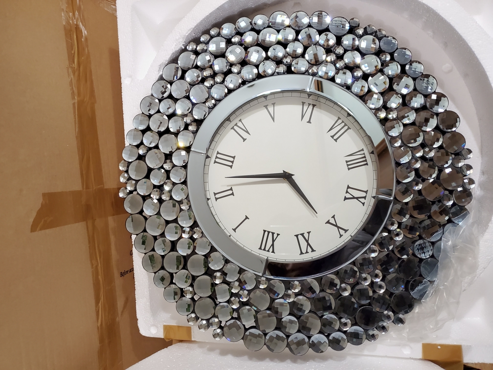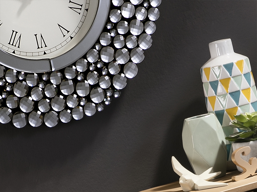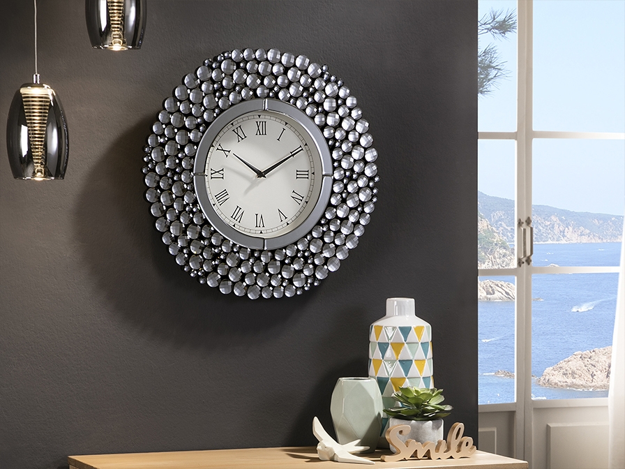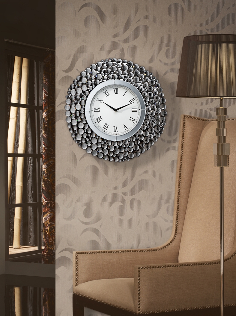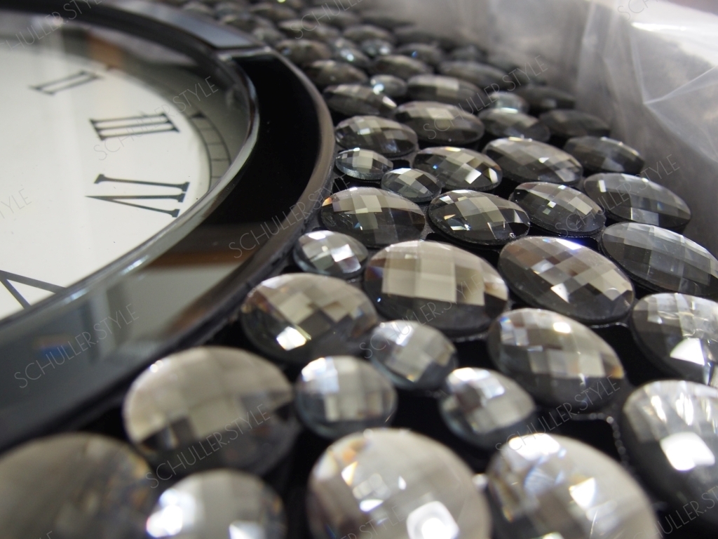 Современные, круглые часы в оригинальной резной раме, украшеной каплями прозрачных зеркал в виде полусфер с многочисленными бликующими гранями. Основание часов от испанской фабрики Schuller выполнено из МДФ чёрного цвета.