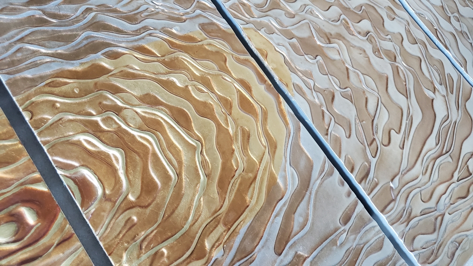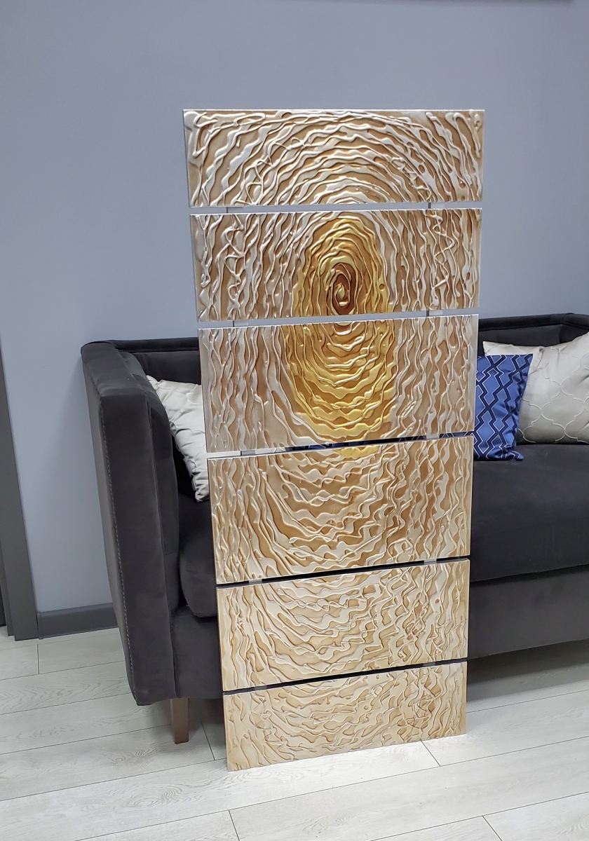 Оригинальный современный настенный декор "Сияние" в золотисто- серебрянных тонах. Абстракция объемного рисунка с игрой света. Основа из МДФ серебряно- стальная с дальнейшим акцентным патинированием рисунка медно- золотистым тоном. Модульный тип изготовления картины из 6 элементов разной ширины. Покрытие нанесено вручную. Изготовлено в одном экземпляре.