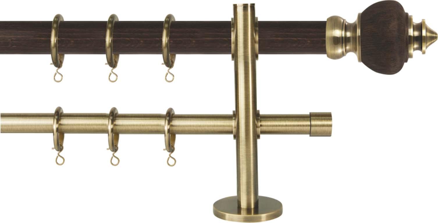 Двухрядный классический карниз 160 см полностью в сборе. Первая декоративная труба для портьер ø30 mm изготовлена из дерева в цвете венге . В комплект входят: 2 направляющие, 2 декоративных наконечника в форме красивых корон с сочетанием фигурных элементов из латуни и дерева, 2 кронштейна двухрядных, 2 заглушки и 40 колец.