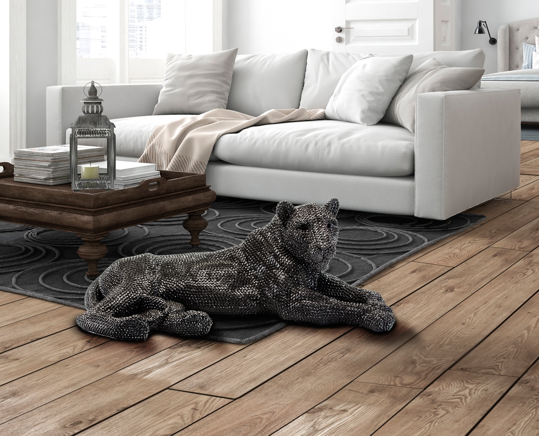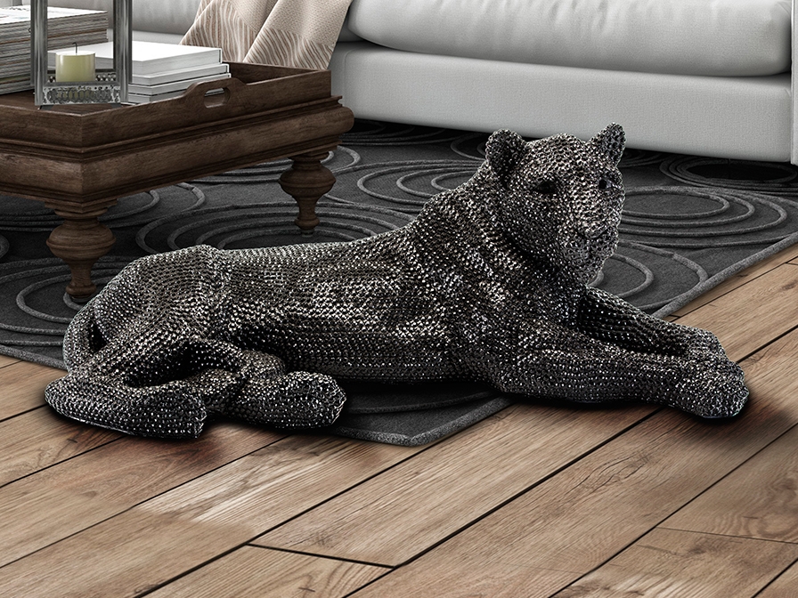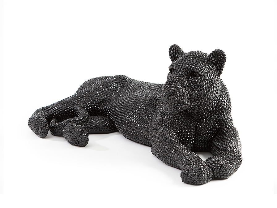 Большая эффектная интерьерная фигура лежащей львицы Leona из полистоуна с фактурным глянцевым покрытием чёрного цвета, имитирующим инкрустацию стразами. Ширина 101 см. Стильный предмет для оформления пространства современного помещения.