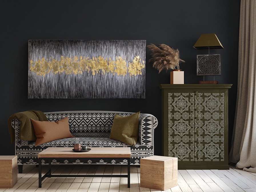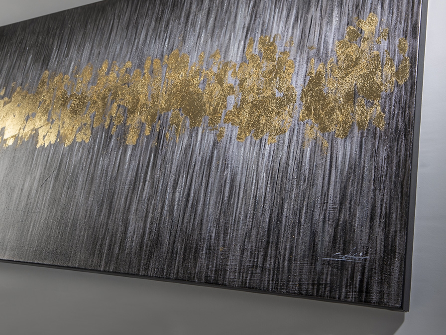 Стильная современная картина Sendero в серых тонах написана акриловыми красками на холсте с эффектным декором золотой фольгой. Закреплена на подрамнике, готова к навеске в горизонтальном положении .