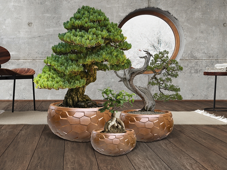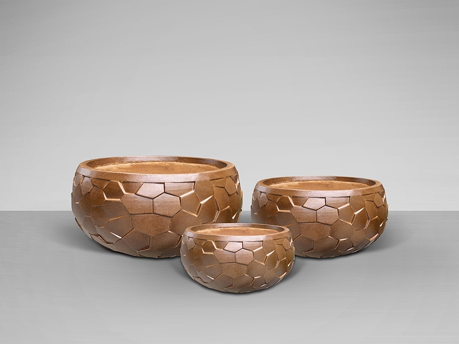 Невысокие широкие цветочные горшки Canela от Schuller c бронзовой отделкой поверхности. В сет входят 3 шт с размерами: