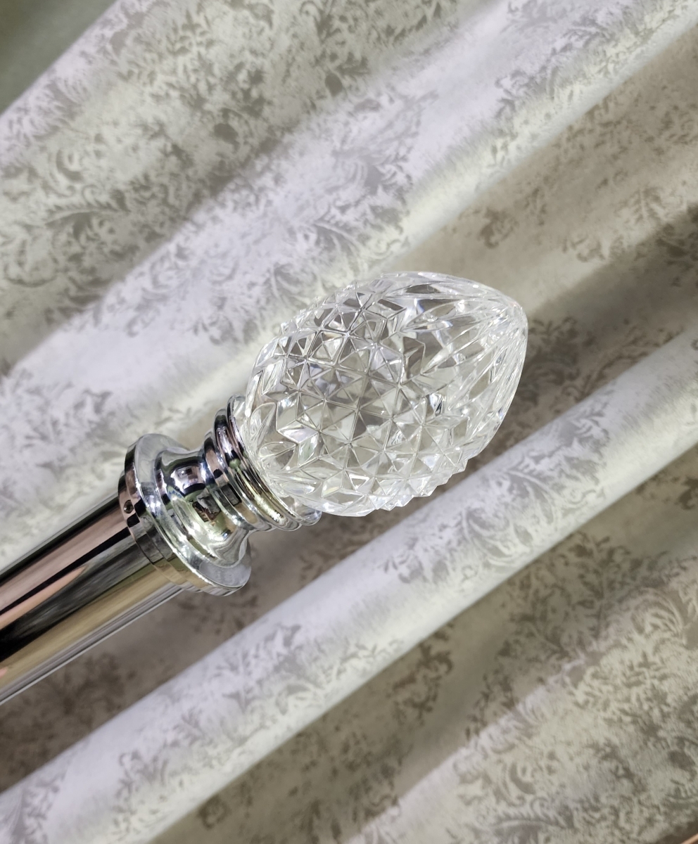 Эффектный дизайнерский наконечник из прозрачного акрила для карниза диаметром 38 мм. Форма шишки с многочисленными гранями красиво преломляет попадающий на неё свет. Интересное решение при оформлении шторами зала, гостиной комнаты либо современной спальни. Эта модель прекрасно сочетается с различными видами штор и тканей, подчеркивая их красоту и фактуру. Прекрасная возможность преобразить окно с помощью стильного аксессуара. Наконечник состоит из двух частей: декоративной прозрачной шишки с резьбой на конце и металлического хромированного основания, что очень удобно при транспортировке и монтаже, тк в таком варианте акриловый наконечник трудно повредить. Продаётся от одной штуки.