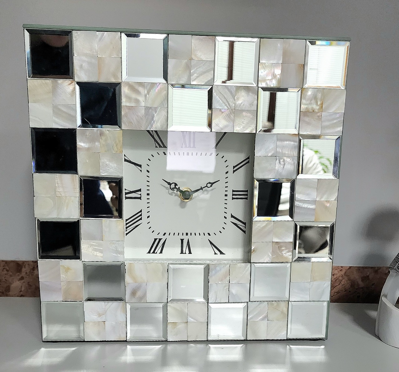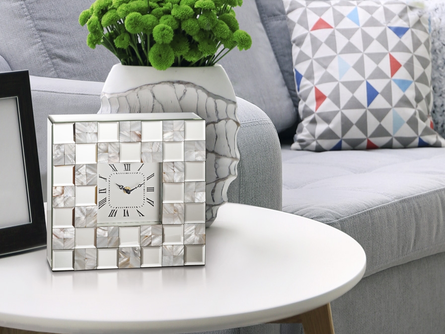 Оригинальные, зеркальные, настольные часы Nacar -украшение современного интерьера сделаны из зеркальных квадратов с фацетом в сочетании с эффектным перламутром. По периметру с трех торцевых сторон расположены эффектные зеркальные пластины. Задняя сторона черного цвета. Часы на маленьких ножках.