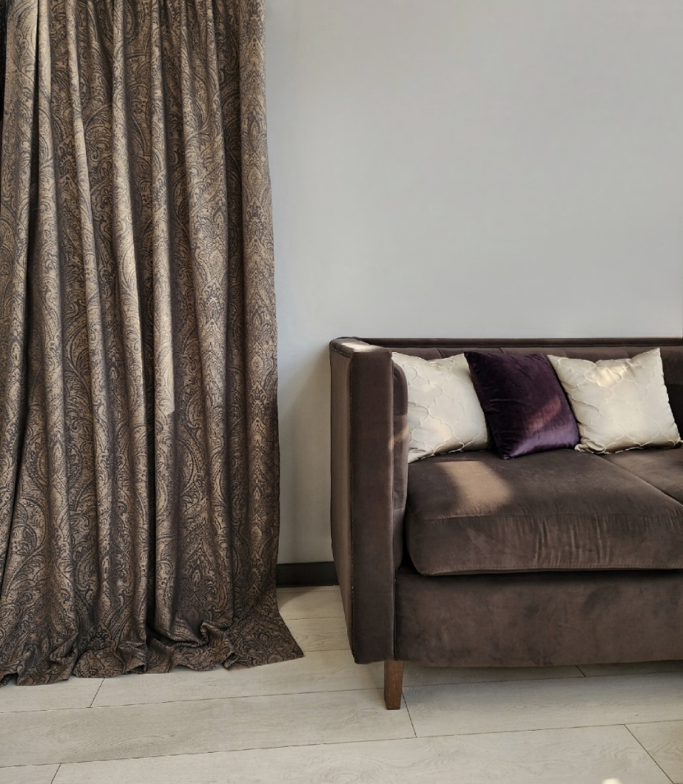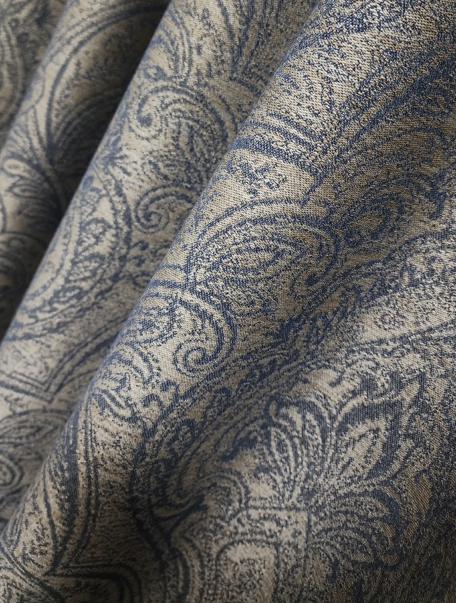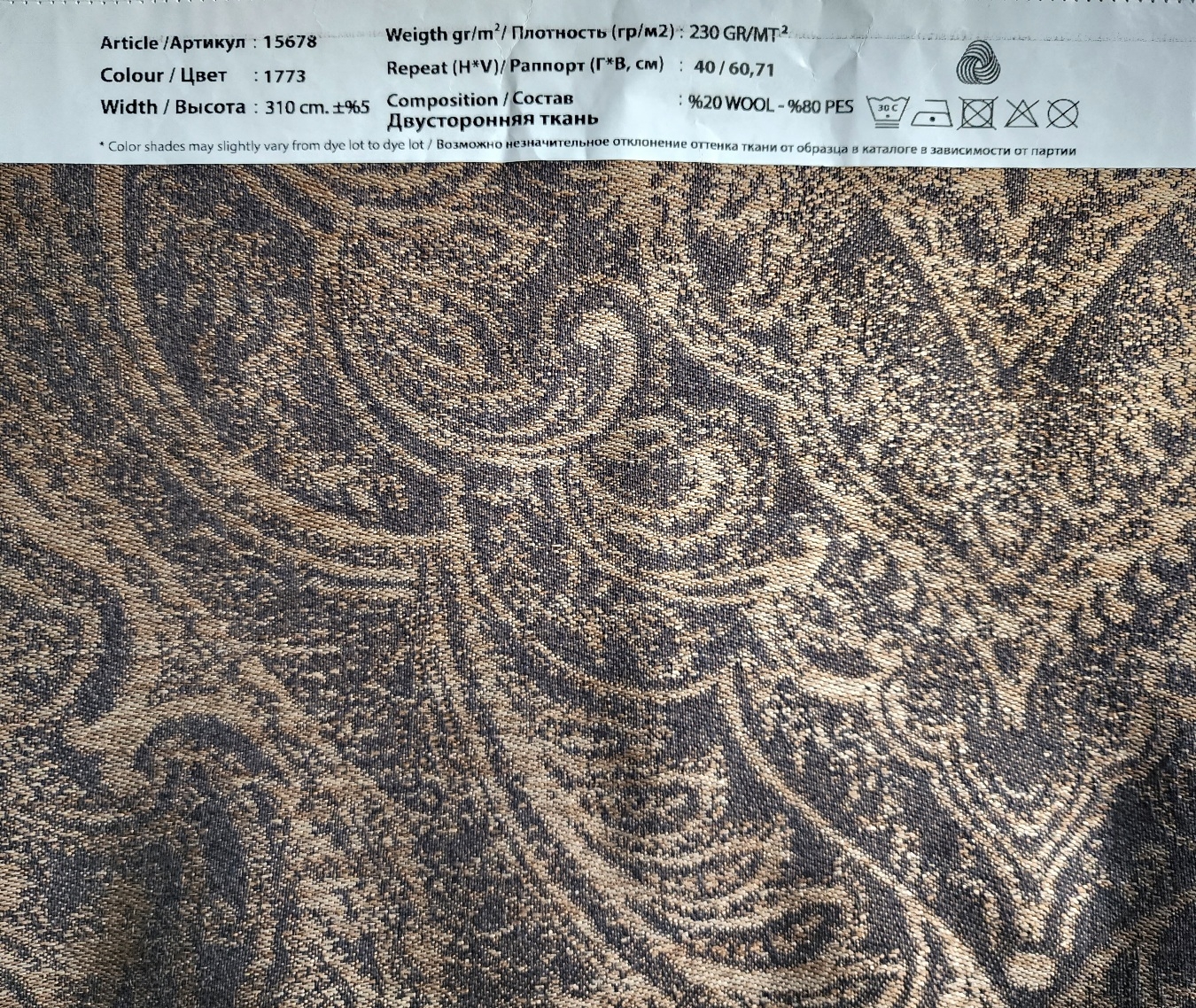 Портьерная ткань с крупными рисунком и 20% натуральной шерстью в составе. Пластичная, мягкая, хорошо драпируется в складках. Бежевый фон с коричнево- рыжеватыми нитями, особенно заметными при попадании солнечного света или теплого света от люстры, и черными контурами рисунка с одной стороны и обратной инверсией цветов на изнанке дает возможность использовать материал с любой стороны. Ткань можно стирать при температуре 30 градусов и гладить при деликатном режиме.
