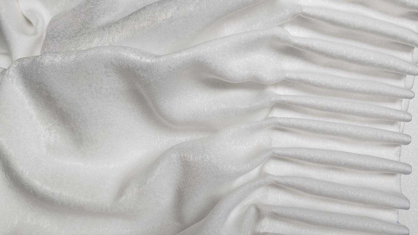 Белая непрозрачная тюлевая ткань Kitagawa с совсем легким бежевым оттенком и чуть проступающим объёмным мелко- зернистым рисунком. Пластичная, хорошо драпирующаяся, очень приятная на ощупь шелковистая ткань с легким блеском с лицевой стороны. В готовом изделии ассоциация с белым муаровым свадебным платьем :). При хорошем освещении смотрится как белый цвет, при приглушенном теплый оттенок сильнее заметен. Благодаря тому, что ткань непрозрачная, плотная по фактуре, её можно использовать в комнате без портьер. И это настоящая находка для помещений, когда есть желание не "перегружать" интерьер, оставляя больше свободного пространства либо когда комната находится на солнечной стороне.