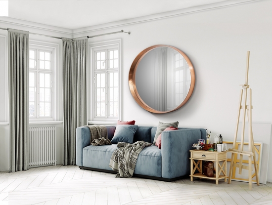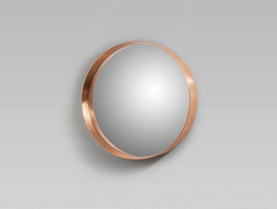 Стильное большое круглое зеркало из новой коллекции Mia фабрики Schuller в тонкой раме из полиуретана с отделкой золотой фольгой розового оттенка. Данную модель производят ещё в двух цветах: золотом и темно-бронзовом. Диаметр настенных зеркал составляет 102 см, глубина 7,5 см. Зеркальная поверность утоплена вглубь рамы.