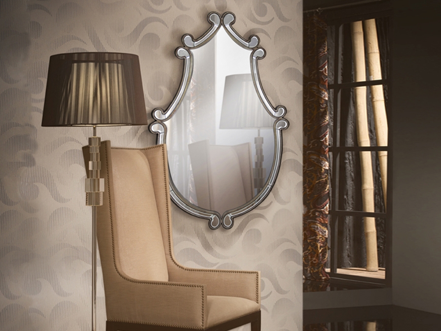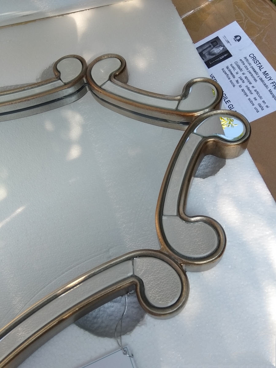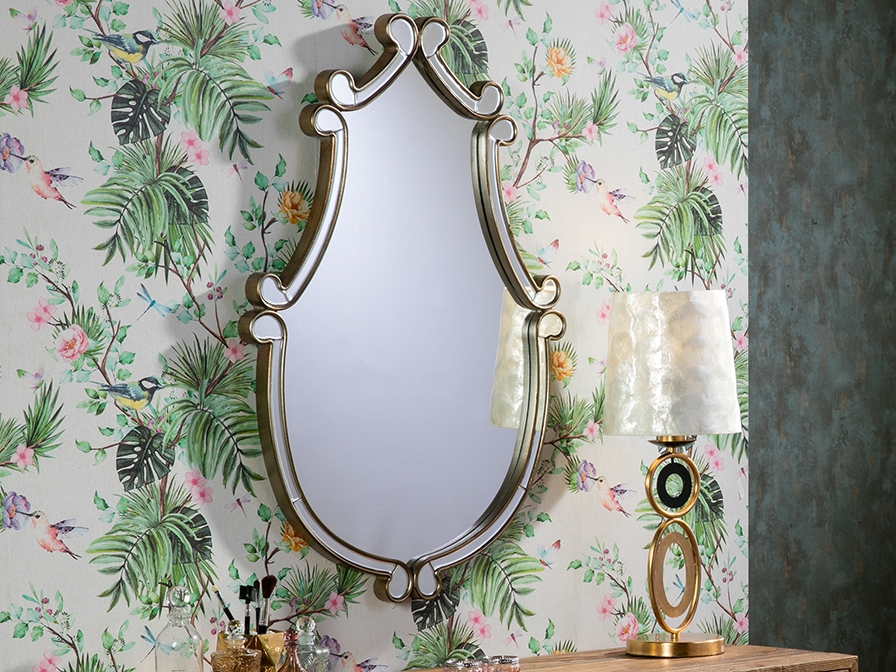 Фигурное небольшое зеркало Claudia в оригинальной раме с зеркальными элементами в обрамлении состаренного золота с патиной .