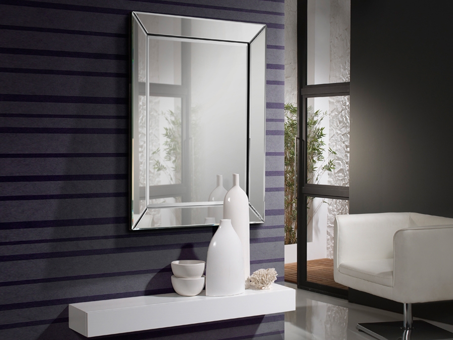 Зеркало прямоугольное из зеркальных полотен с фаской, установлено на основе из дерева и MDF чёрного цвета. Подготовлено для установки в горизонтальном или вертикальном положении.