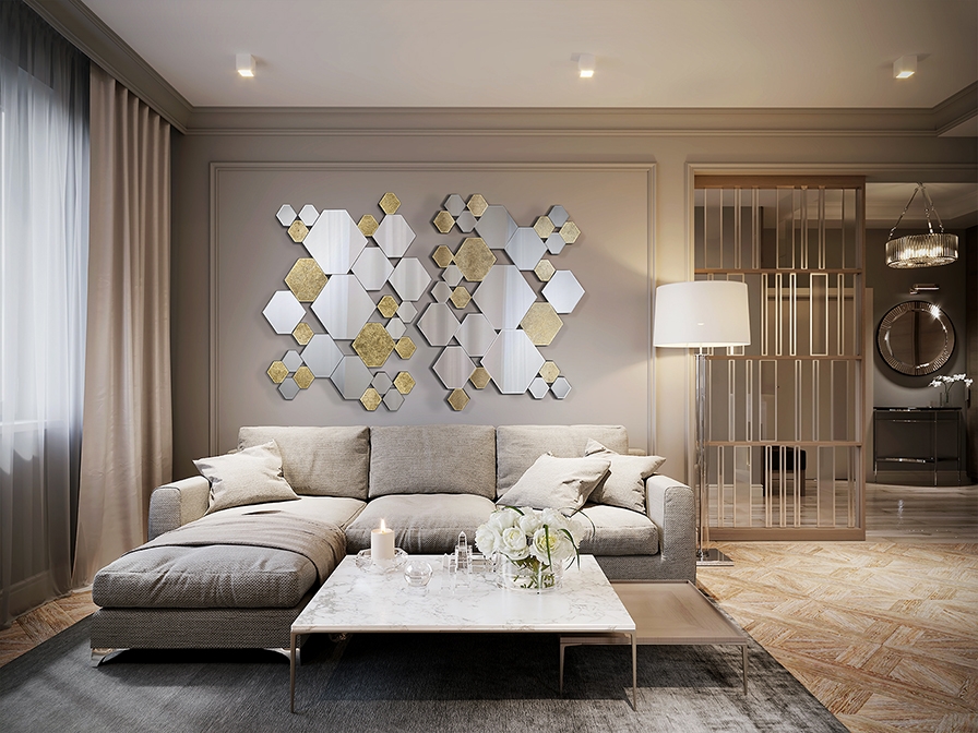 Стильный зеркальный декор на стену от фабрики Schuller. Оригинальные зеркала- шестигранники разных размеров с фацетом по периметру красиво скомбинированы с декоративными, у которых эффектная золотая фольга защищена сверху стеклом. Основание единое из черной резной МДФ. Навеска возможна как горизонтально, так и вертикально. Дизайнерский декор- это всегда актуальное украшение для современного интерьера, которое даёт возможность создать уникальное уютное пространство для повседневной жизни. Панно можно заказать в нашем интернет магазине на сайте, либо позвонив по телефону в Москве.