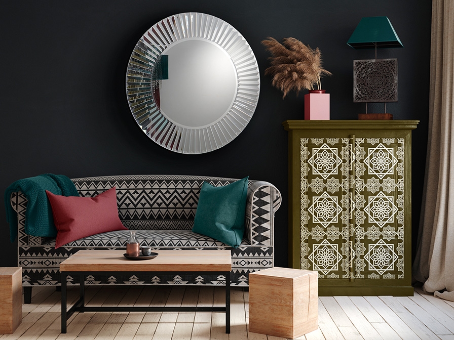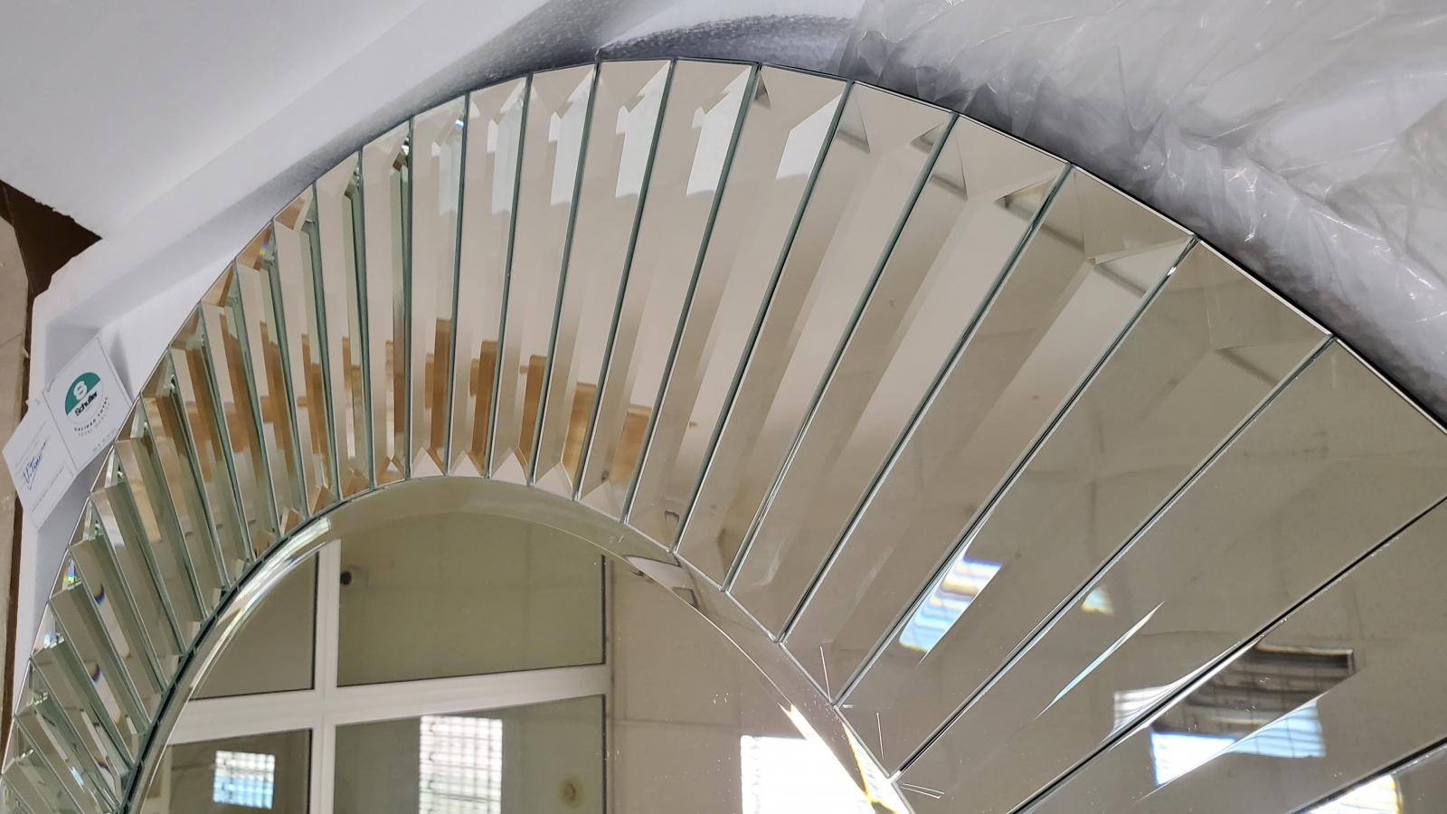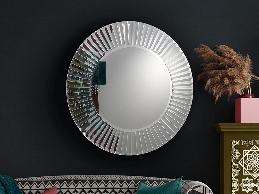 Современное круглое зеркало с фацетом по периметру центрального полотна. Интересная рама сделана из зеркальных полосок, красиво отражающих свет под разными углами, украшая и расширяя интерьерное пространство. Основание чёрное из MDF.