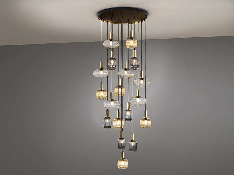 Современный высокий светильник- каскад из коллекции Norma c 18 рифлеными стеклянными плафонами разного цвета и форм. Основание изготовлено из металла, окрашенного в матово-черный цвет, с отделкой внутренней окантовки в цвет сатинированной латуни, также как и декоративные трубки у подвесов. Плафоны сделаны из прозрачного бесцветного, янтарного и дымчато- зеркального стекла. Каждый подвес регулируется по длине, поэтому можно по-разному составить композицию даже на одной высоте. Максимальная высота может быть 5 м.