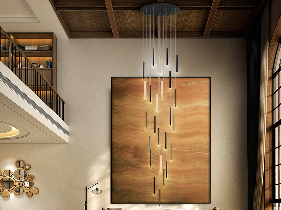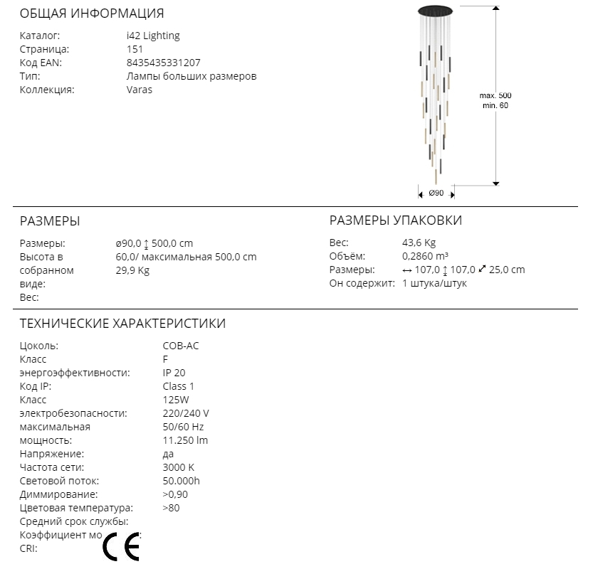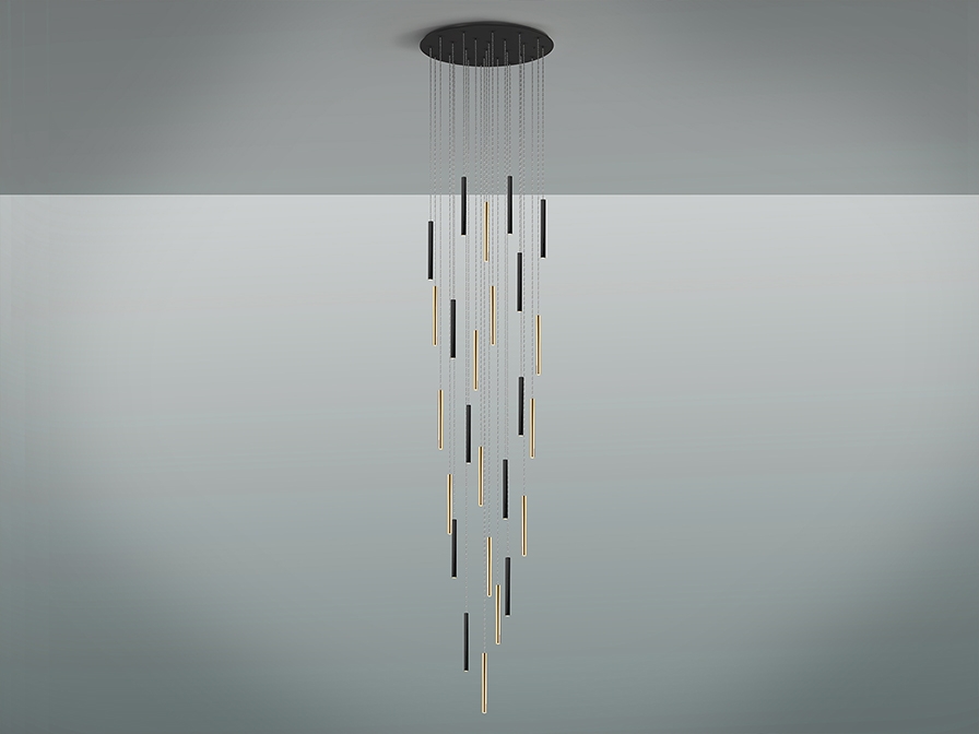 Большая эффектная люстра диаметром 90 см из коллекции светодиодных светильников Varas для интерьеров с высоким потолком. Максимальная высота подвешивания- 500 см. Каскад глянцево- золотых и матово- черных трубок диаметром 3 см с акриловым рассеивателем опалового цвета внизу каждой. 125W LED, 11250 lm, теплый свет 3000 K. Средний срок службы рассчитан на 50 000 часов. Кабель прозрачный.