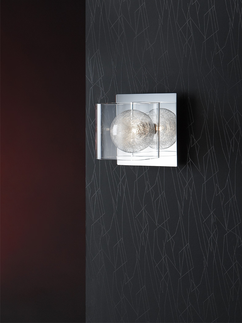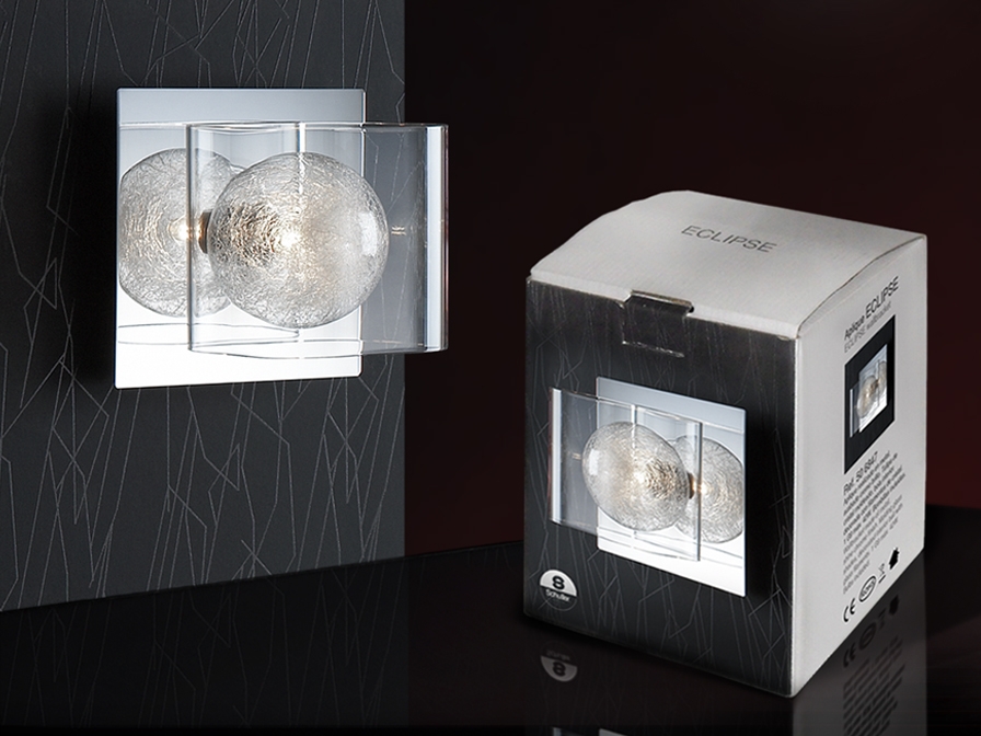 Бра настенное Eclipse с оригинальным двойным плафоном из прессованного стекла с внутренним шаром, украшенным тонким стекловолокном. Основание в цвете глянцевого хрома. 1 лампочка с цоколем G9 LED 7,5W тёплого света поставляется в комплекте. Максимально возможная мощность лампы 42 W.