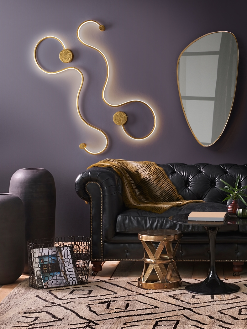 Стильная модель настенных led бра Grafos фабрики Schuller выполнена с отделкой каркаса золотой фольгой. Фигурная, витиеватая форма из алюминия красиво смотрится и в качестве арт объекта, и как оригинальное дополнение интерьера современной комнаты, особенно, если скомбинировать несколько моделей светильников разной формы или цвета. Светильник крепится к стене в двух местах: в начале и в конце завитка. Световой поток: 19,5W. 900 lm. 3000 K. Расчётное время работы: 30 000 часов.