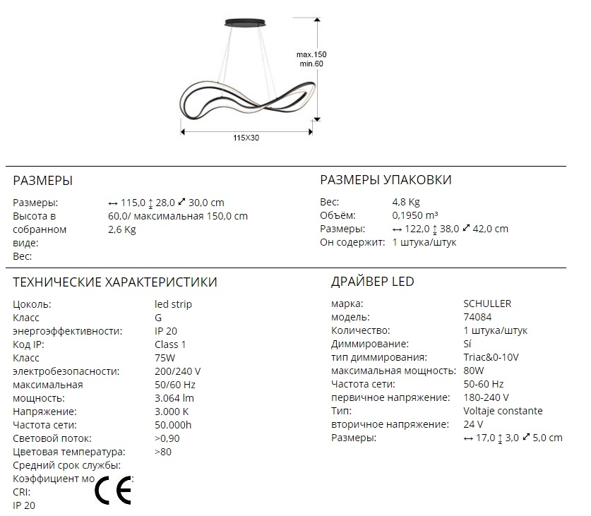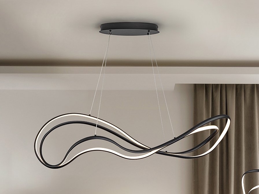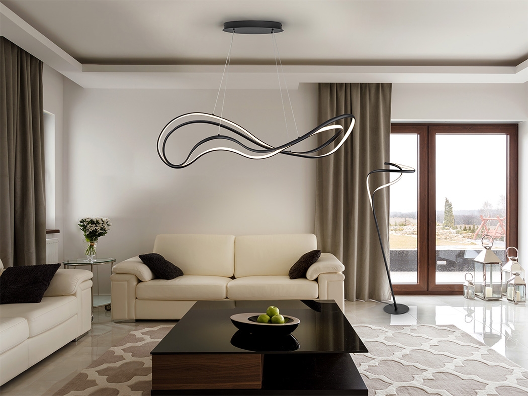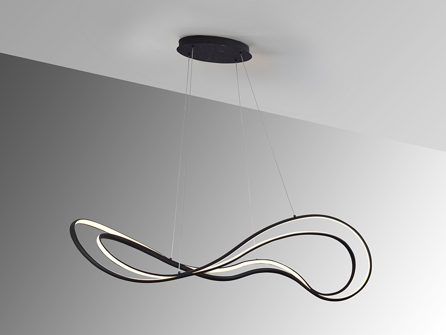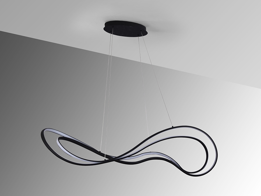 Необычный парящий светильник Danza 513177 в виде двух фигурных волн, дублирующих друг друга. Легкий абажур изготовлен из алюминия с матовым черным покрытием, обработанным пескоструйной обработкой. Рассеиватель по его контуру сделан из силикона опалового цвета. Потолочное основание стальное также черного цвета. Светодиоды мощностью 75 Вт, 3064 Lm, теплый свет 3000 К. Средний срок службы: 50000 часов. Интересная модель шириной 115 см c регулируемой высотой подвешивания отлично смотрится в современных интерьерах. Любители футуризма или графического дизайна тоже ее оценят.