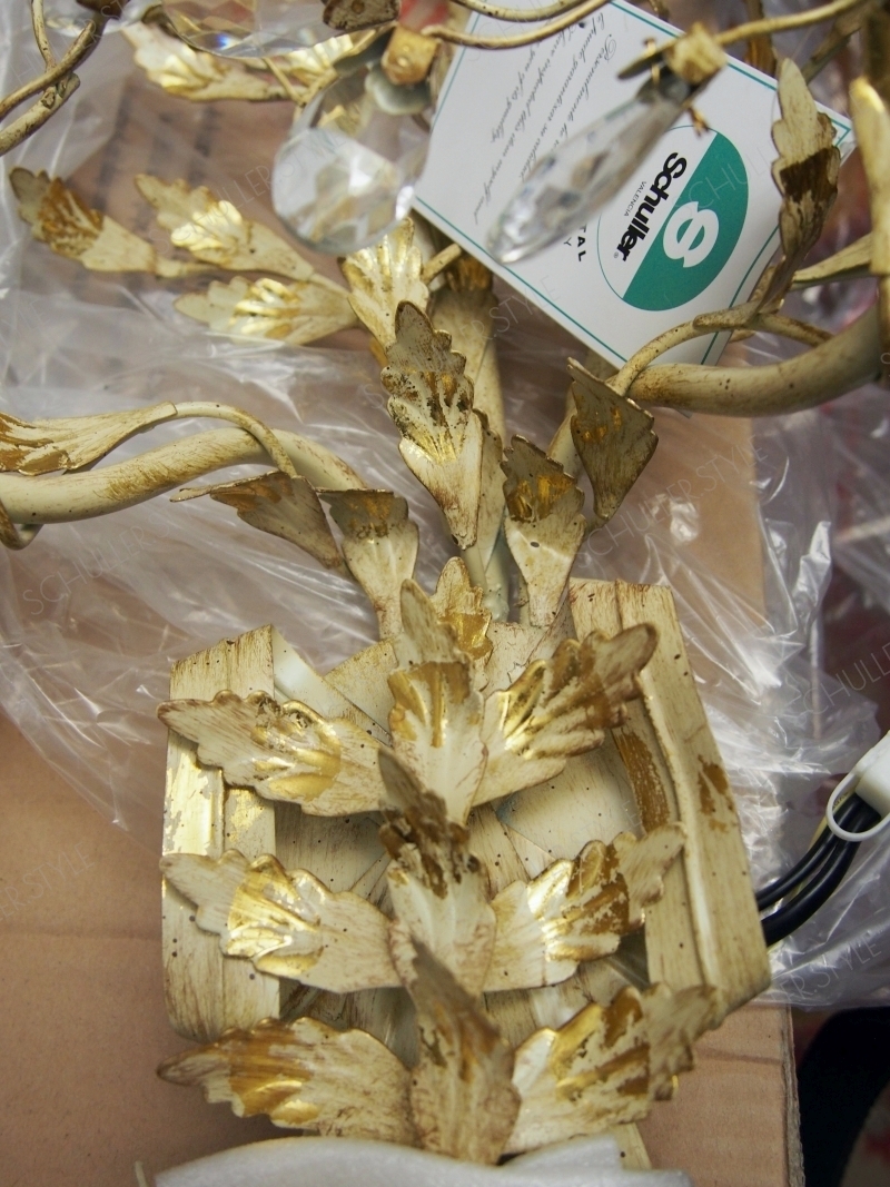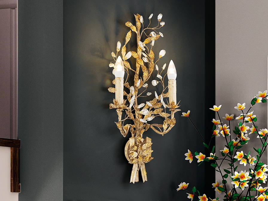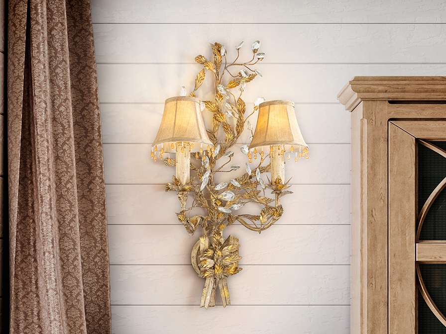 Двойное большое бра во флорентийском классическом стиле от испанского бренда Schuller. Основание выполнено в цвете слоновой кости с золотой патиной. Многочисленные капли- прозрачные стеклянные кристаллы с огранкой служат изящным украшением настенного светильника в форме витиеватых веточек с листьями. Два варианта модели доступны к покупке: с абажурами из коричневой тафты с небольшими подвесками по периметру и без них.