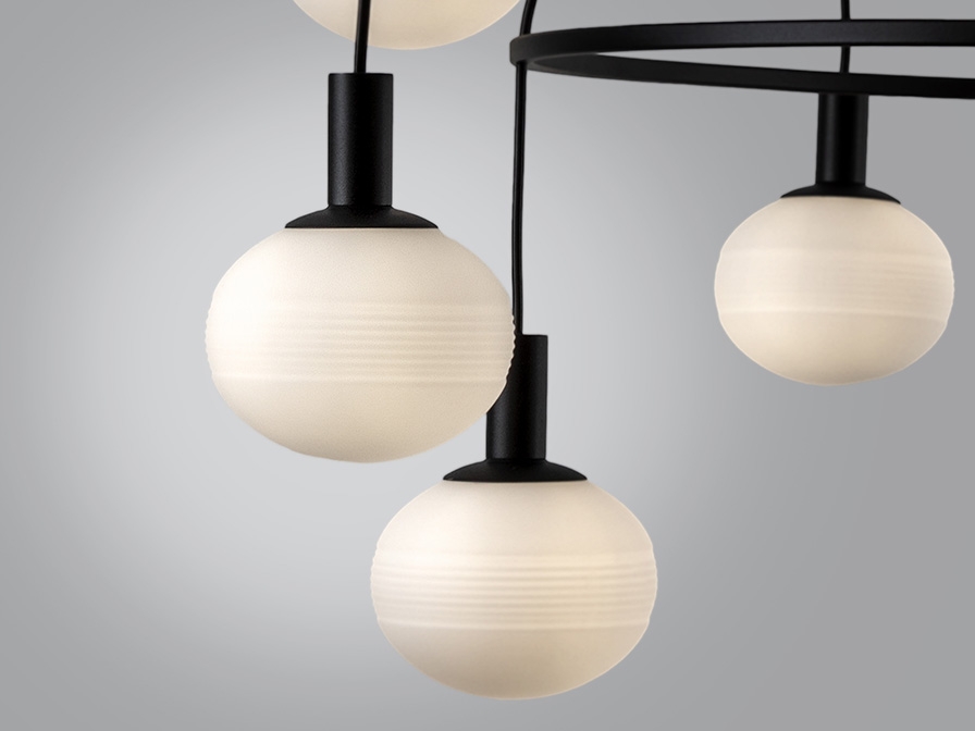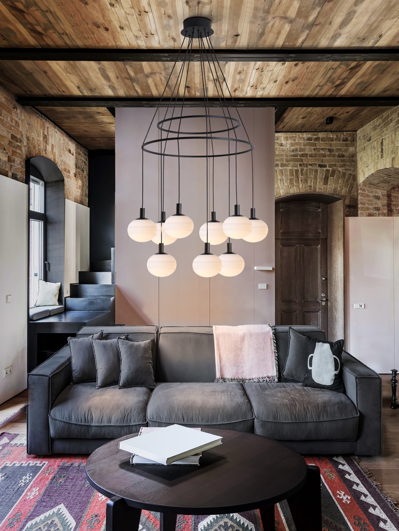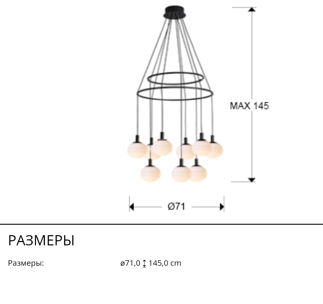 Черная люстра- обруч с белыми матовыми плафонами- стеклянными шарами. Коллекция Global от фабрики Schuller, включает светильники на 9 ламп и на 12. Если высоту каждого подвеса соответственно отрегулировать, то можно создать интересный вид у люстры, с наклоном обручей в разные стороны. Лампочки с цоколем G9 6W led теплого света входят в комплект поставки. Максимально допустимая мощность: 9 шт x42W led.
