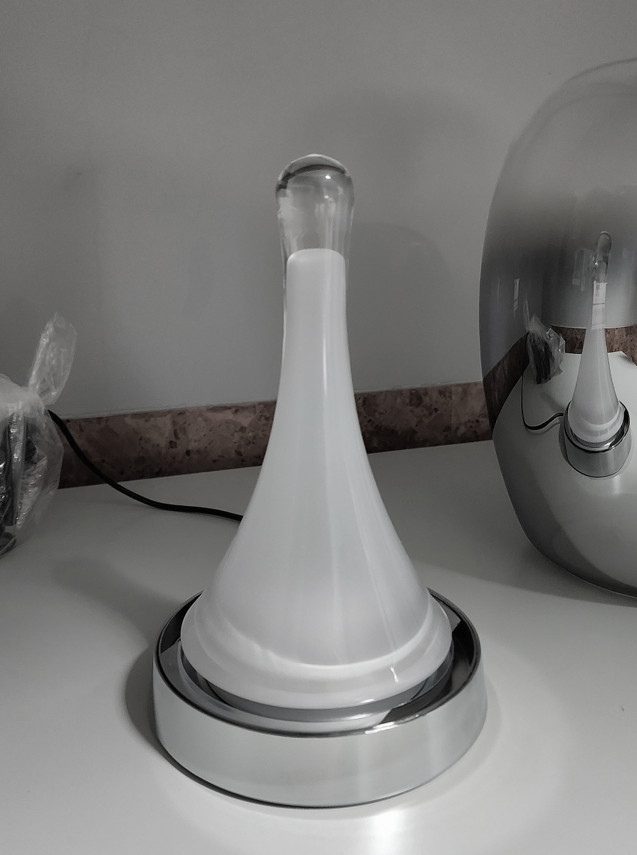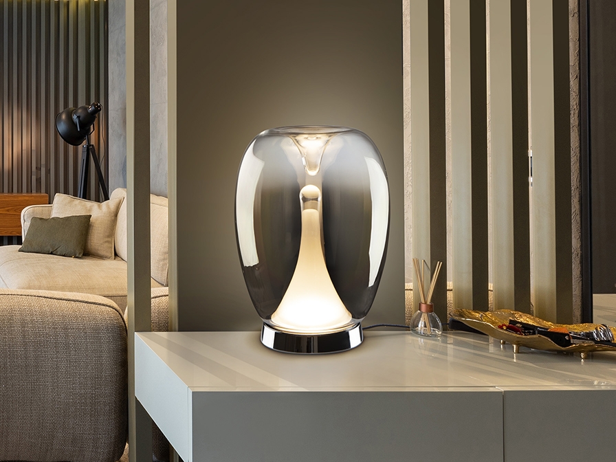 Интересная настольная лампа Suspiro с алюминиевым хромированным основанием и яйцеобразным плафоном диаметром 20 см из выдувного стекла с градиентным зеркальным покрытием, которое отражает окружающий интерьер. Плафон в центре слегка углублен. Внутри светильника расположен, словно сталактит- вертикальный стеклянный рассеиватель опалового цвета. Светодиод мощностью 8,5 Вт, 504 Lm, теплый свет 3000 К.