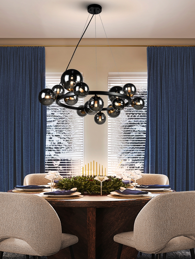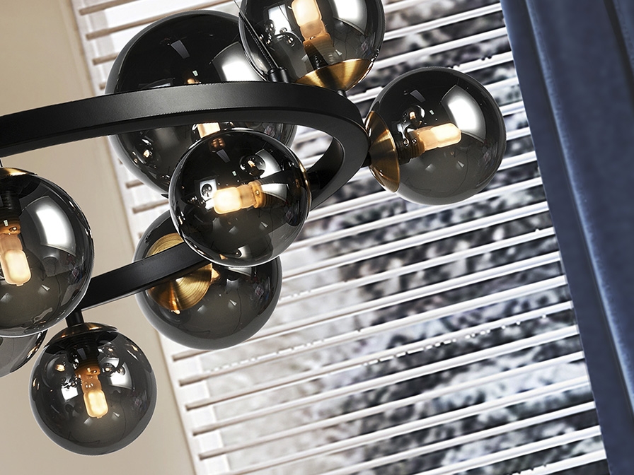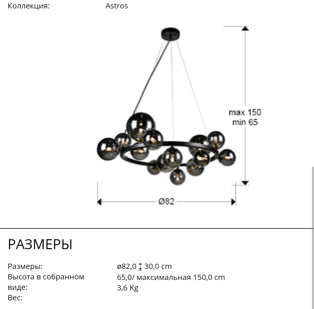 Большая чёрная люстра Astros с 14 дымчато-серыми плафонами- шарами. Изготовлена из металла в матовой черной отделке с акцентными вставками цвета полированной латуни. Длина подвешивания регулируется. Прекрасный вариант для современного интерьера гостиной либо комнаты подростка. Лампочки 14 шт с цоколем G9 мощностью 3.5 Вт включены в стоимость. Максимально возможная мощность 14 G9* LED 4 Вт.